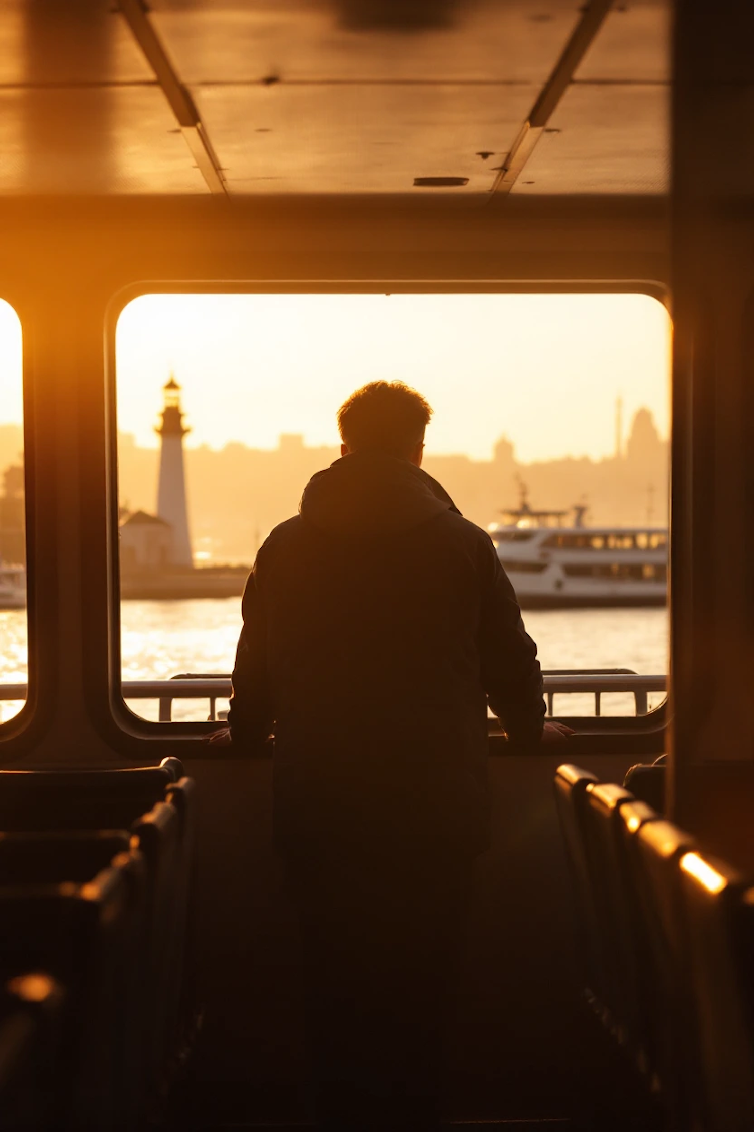 Silhouetted figure on a ferry at sunset, gazing at a lighthouse and another ferry on the water. Warm, golden tones create a serene atmosphere.