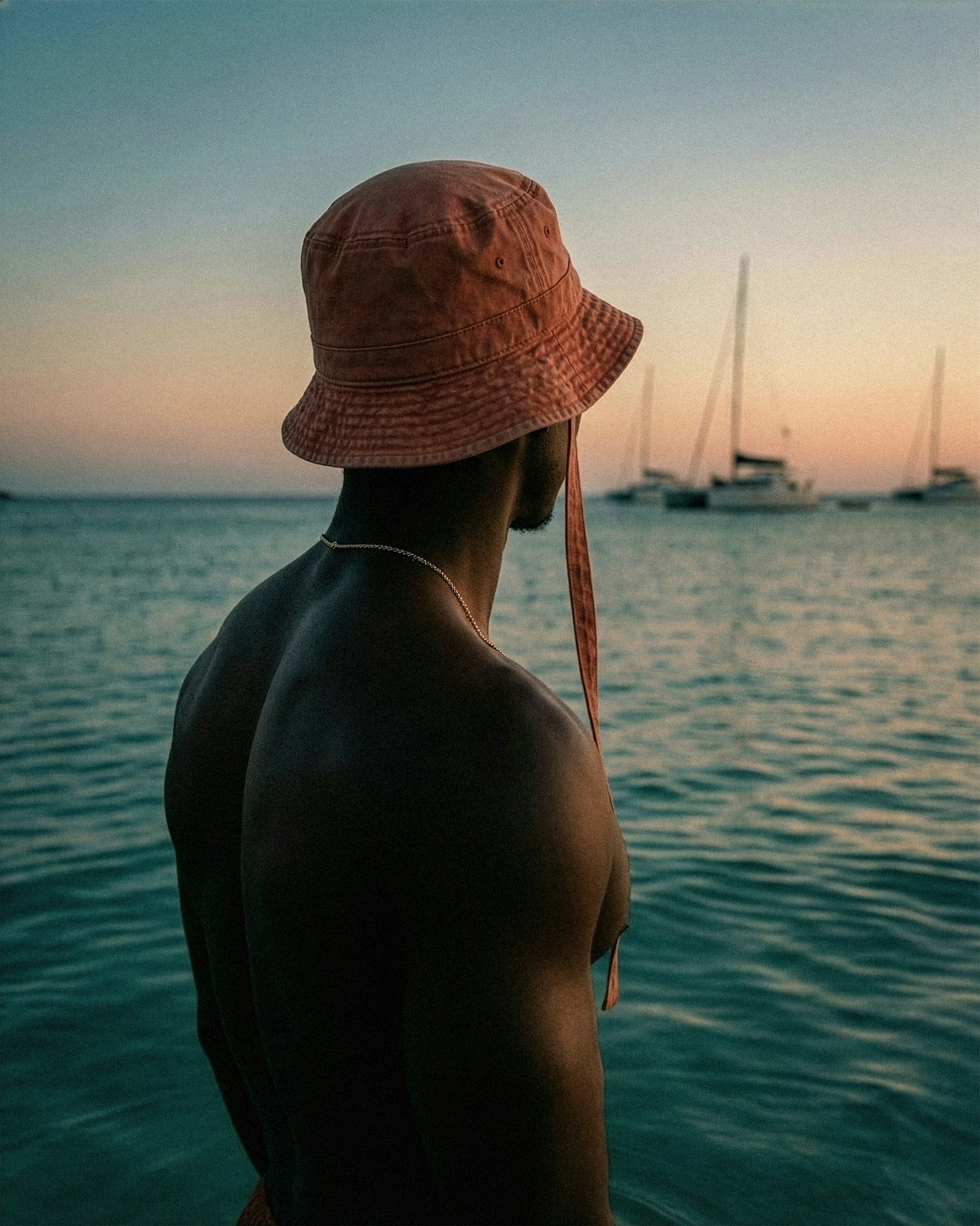 A serene sunset view with a person in a red bucket hat by the water, sailboats in the distance, and a calm, reflective ambiance.