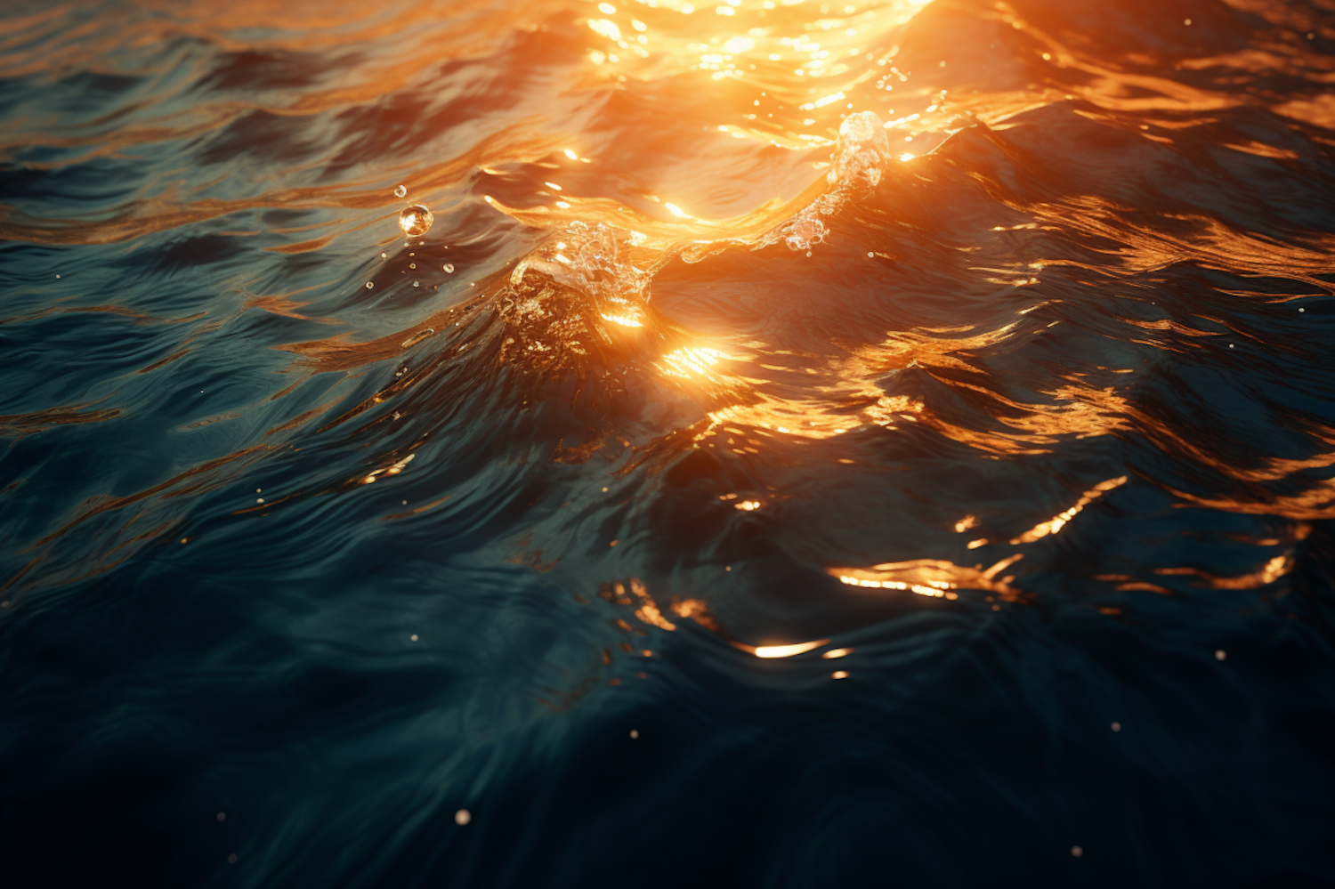 Golden sunlight reflects on rippling blue water, creating a mesmerizing play of light and shadow in a tranquil scene.