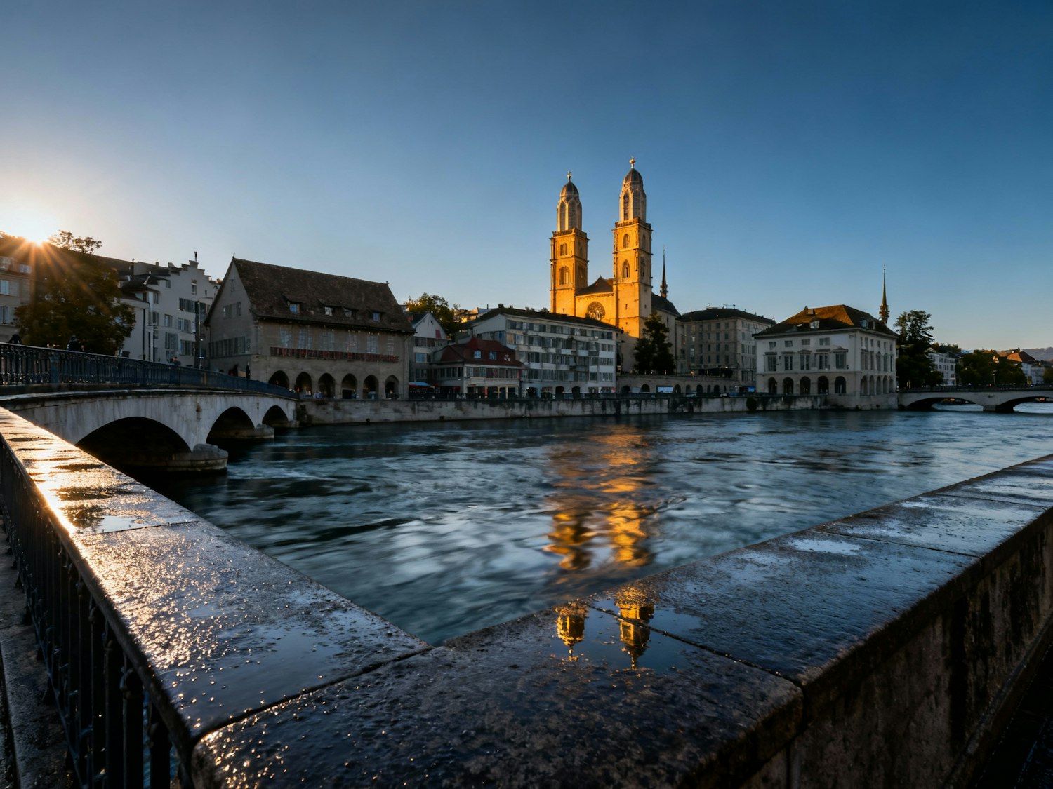 A stunning sunset view of a historic European city with a cathedral, river reflections, and a picturesque stone bridge.