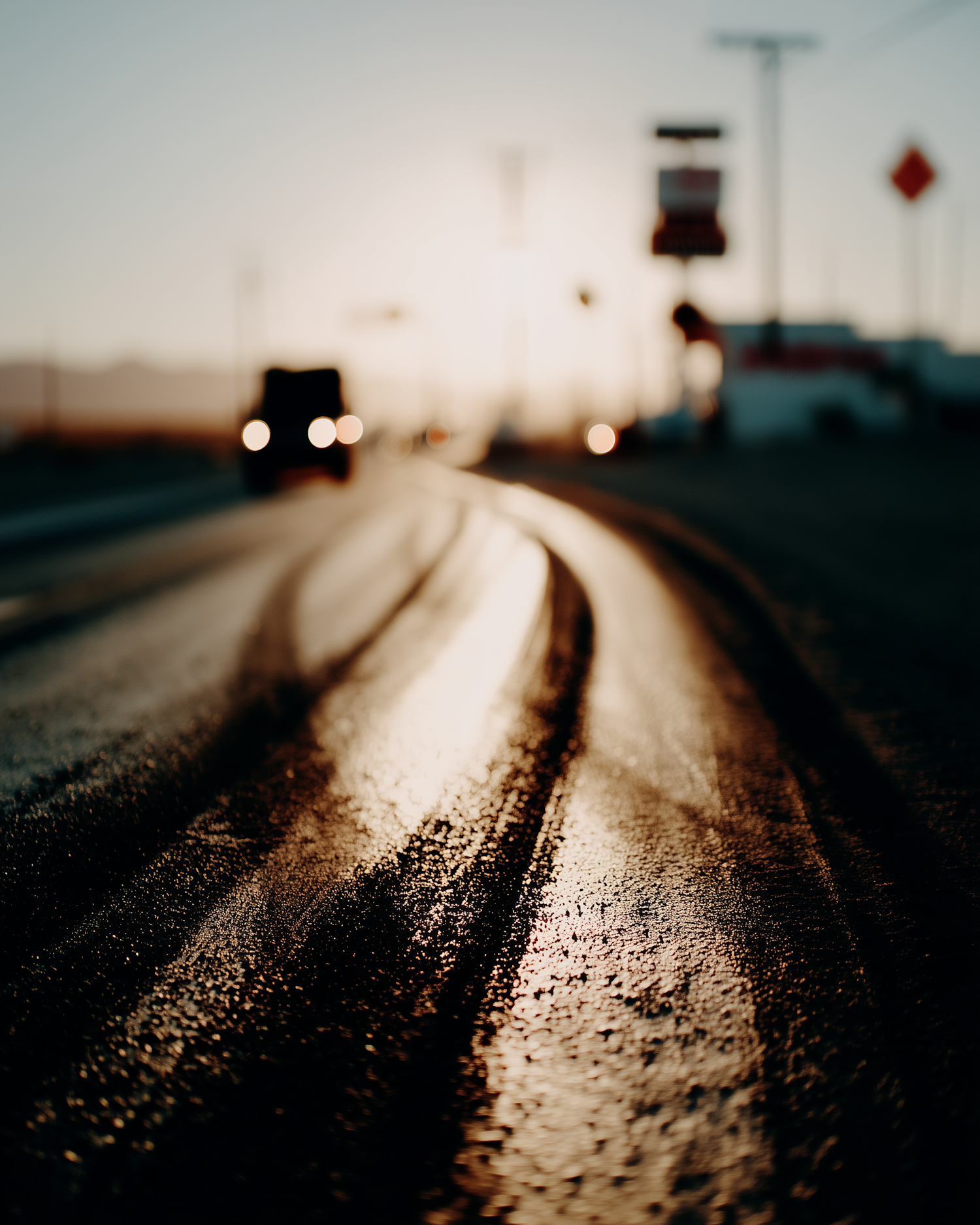 Golden hour light reflects on a wet, curving road with blurred vehicles and signs in the background, creating a serene yet dynamic scene.
