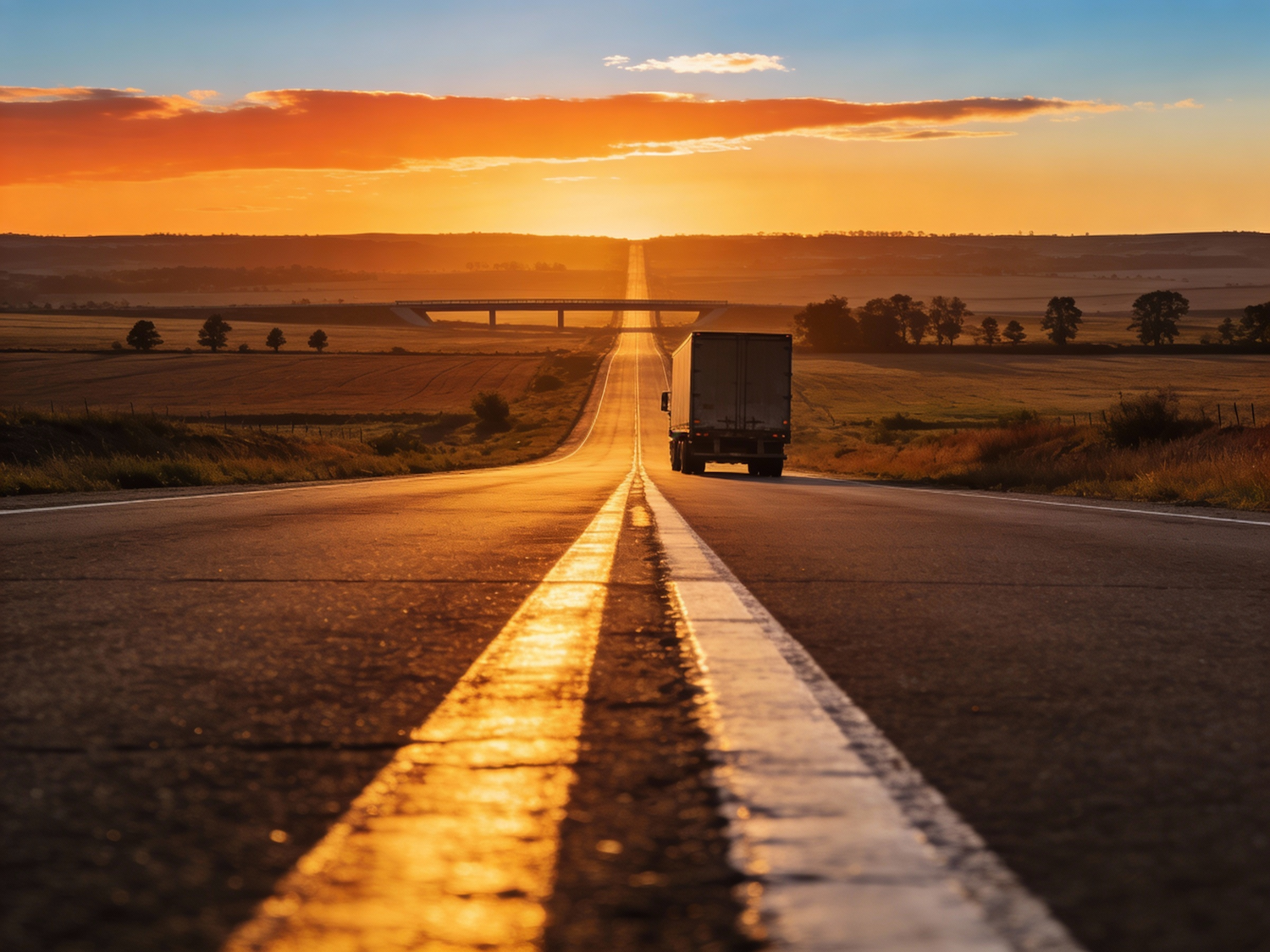 Long straight freight road cutting through open fields at sunset, a single cargo truck driving toward the horizon; dry asphalt glowing slightly in warm light, bright centerline and edge markings acting as strong leading lines; flat farmland, scattered trees and a distant overpass; sky in orange-to-blue gradient with a few soft clouds, calm, spacious logistics mood, ultra sharp, 28 mm.