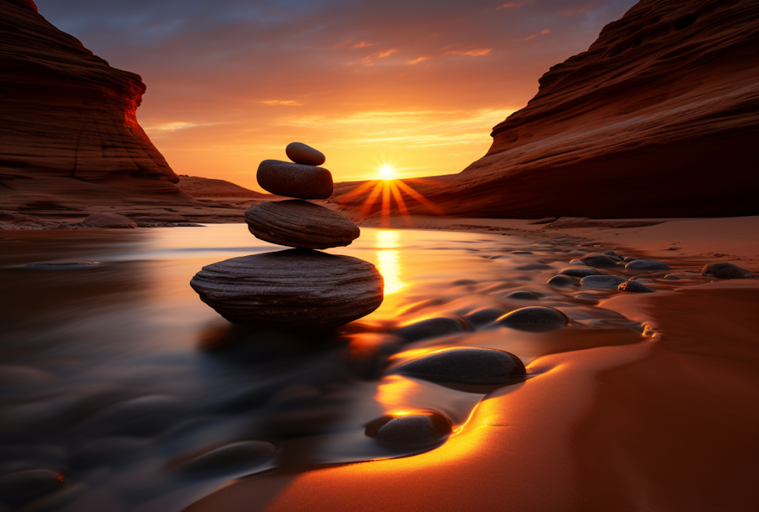 Tranquil sunset over a river with balanced stones and towering rock formations, reflecting warm golden hues and serene beauty.