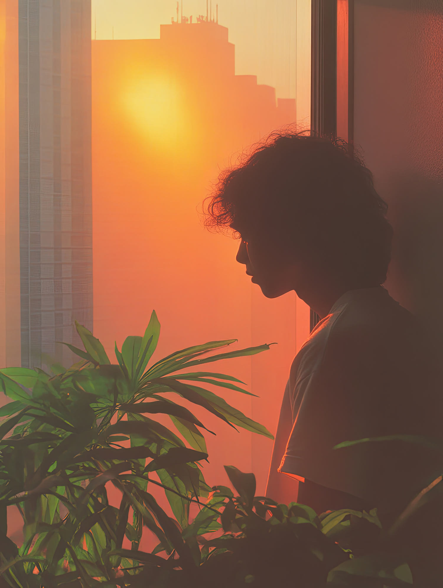 Silhouette of a person by a window during sunset, surrounded by lush green plants and an urban skyline in the background.