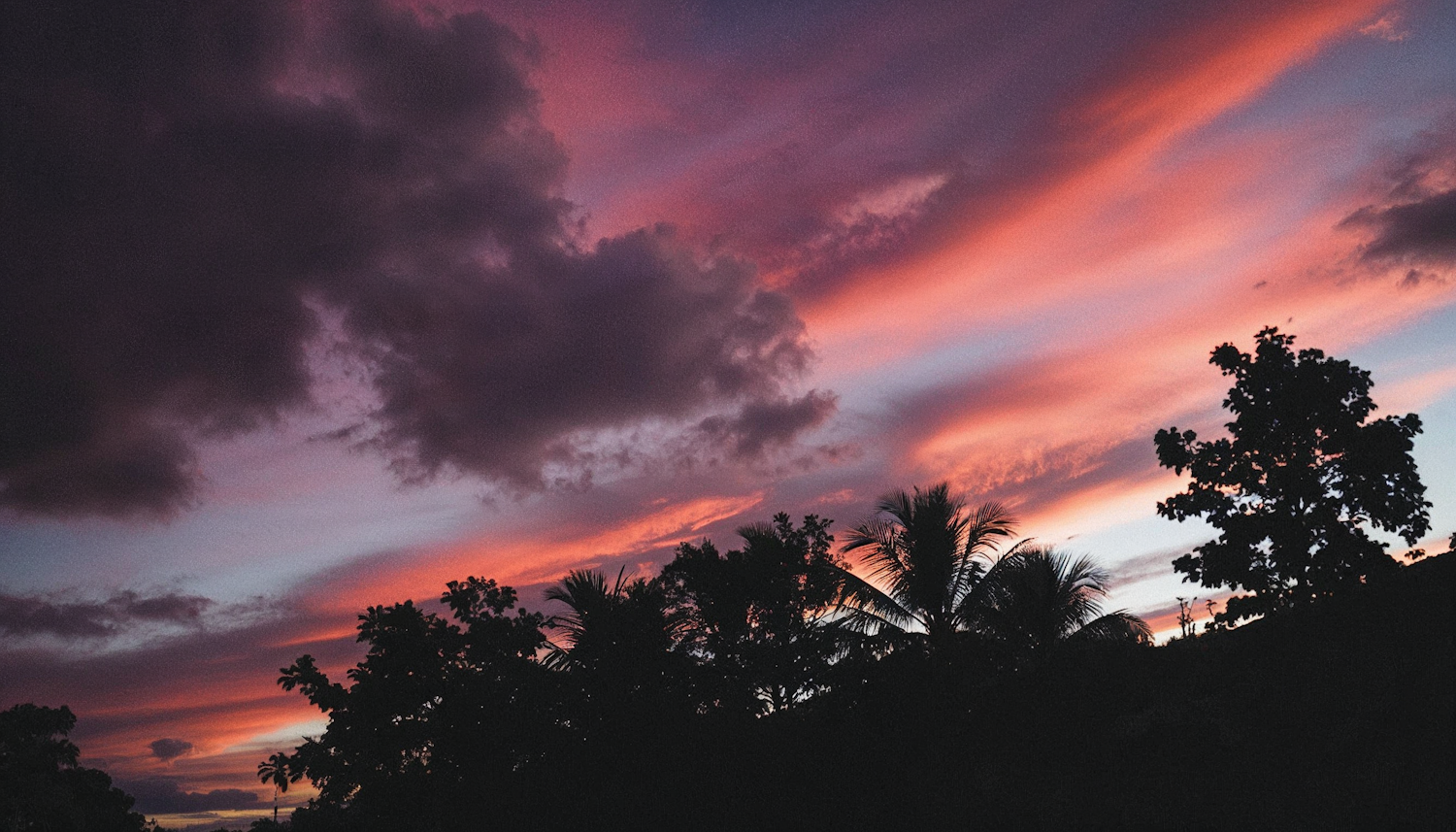 Vibrant sunset with pink and purple clouds over silhouetted palm trees, creating a stunning tropical scene.