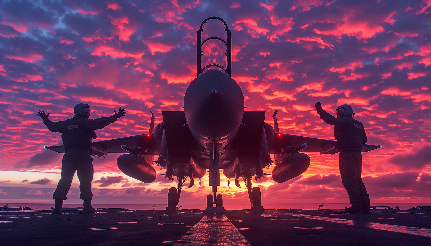 Fighter jet on aircraft carrier deck at sunset, with crew members guiding. Vibrant red and pink sky creates a dramatic backdrop.