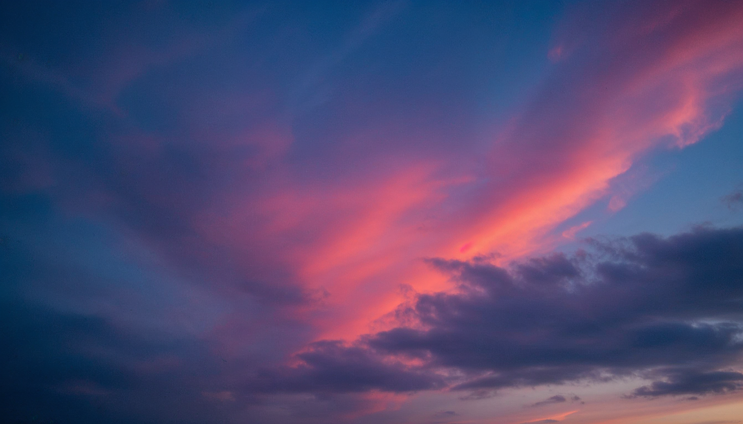 Vibrant sunset sky with pink and orange clouds against a deep blue backdrop, creating a serene and captivating scene.