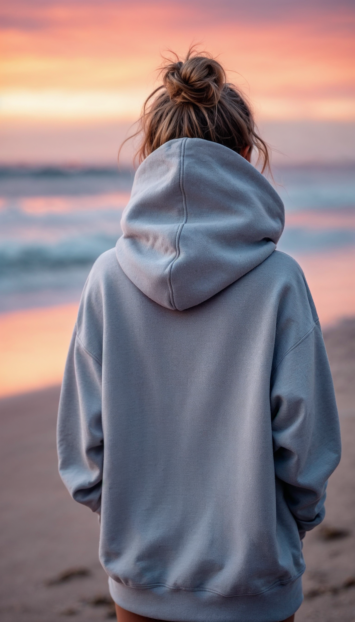 Person in gray hoodie on beach at sunset, facing ocean. Vibrant pink and orange sky reflects on waves, creating a serene scene.