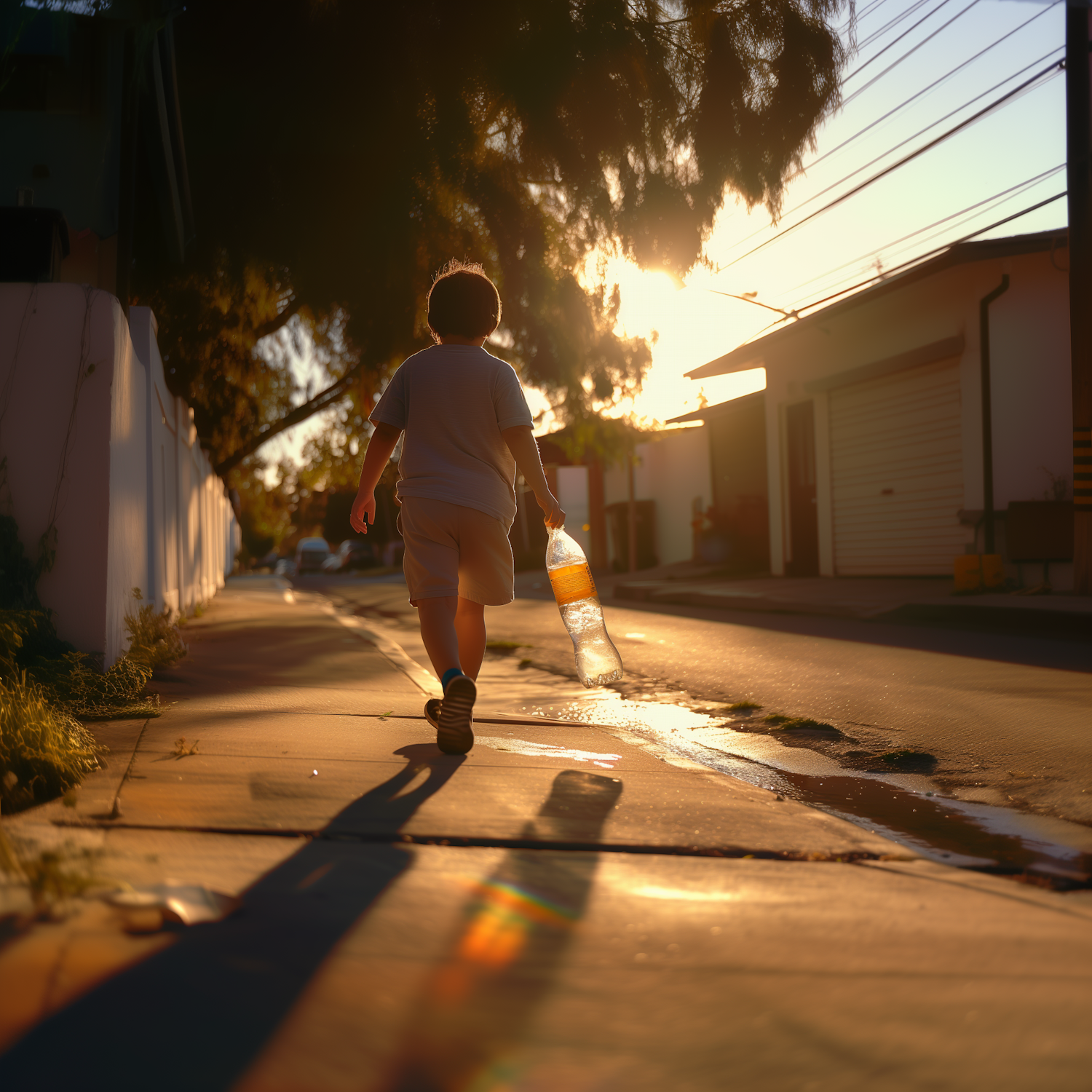 Child walking on a sunlit sidewalk, holding a bottle, casting a long shadow in the golden sunset. Peaceful and serene atmosphere.