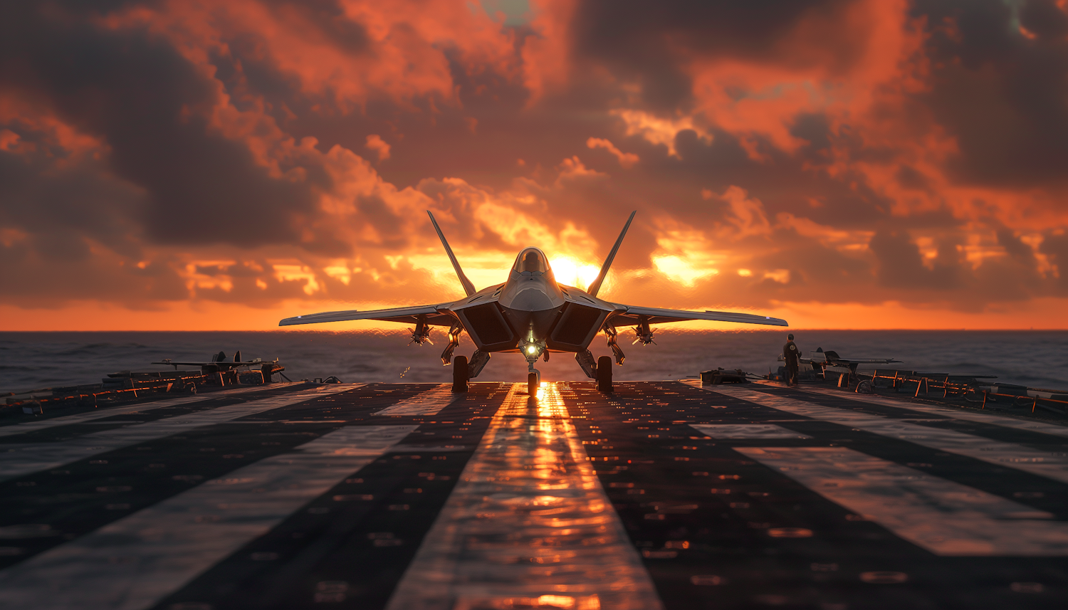 F-22 Raptor on aircraft carrier deck at sunset, dramatic sky, ocean backdrop, crew members preparing for takeoff.