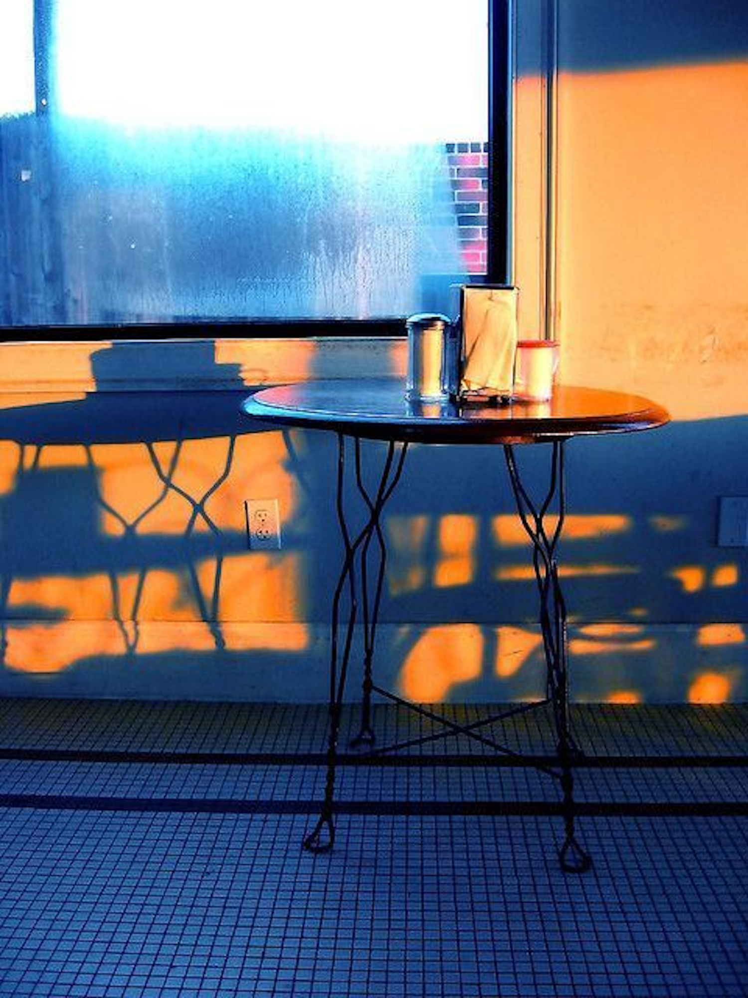 A round table with items bathed in golden sunlight, casting intricate shadows on a tiled floor near a fogged window.