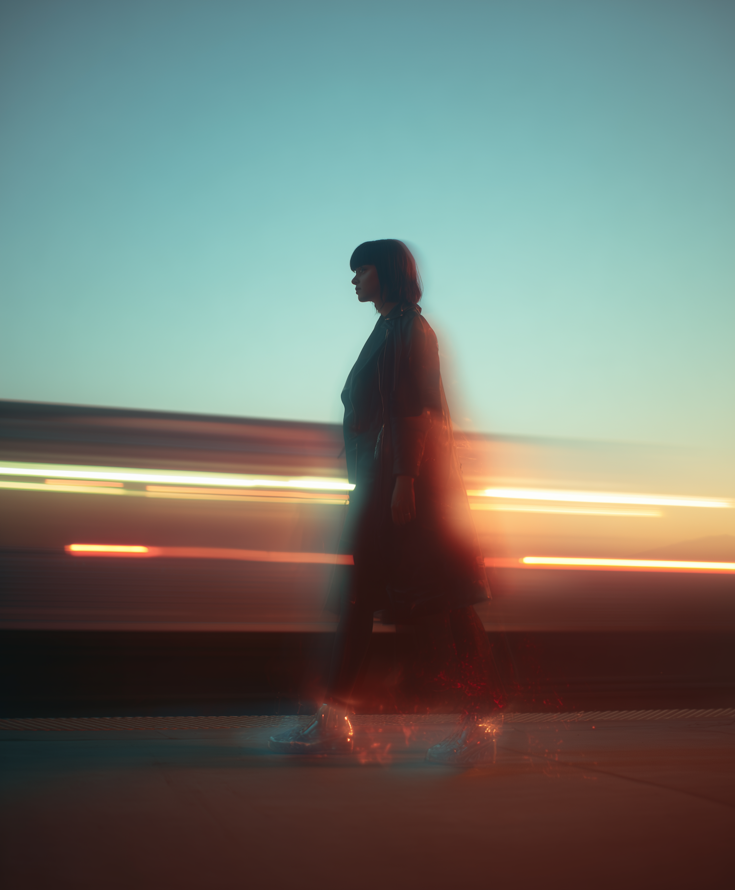 A person walks on a platform with a blurred train passing by, set against a vibrant sunset sky, creating a dynamic and serene scene.
