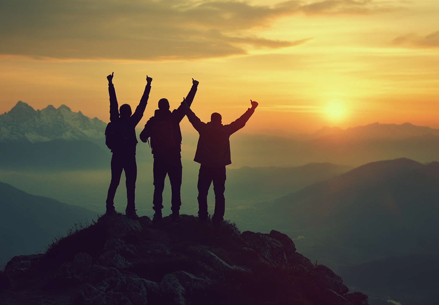 Three silhouetted hikers celebrate on a mountain peak at sunset, with vibrant orange skies and distant misty mountains.
