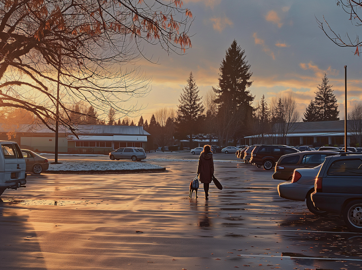 A person walks a dog in a snowy parking lot at sunset, casting long shadows. Bare trees and parked cars complete the serene winter scene.
