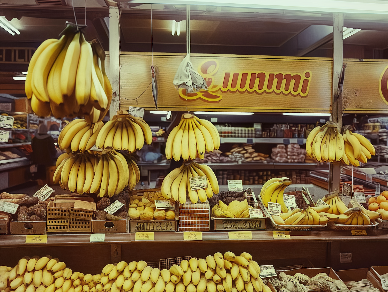 Vibrant market scene with hanging bananas, fresh produce, and colorful signage, creating a lively and inviting atmosphere.