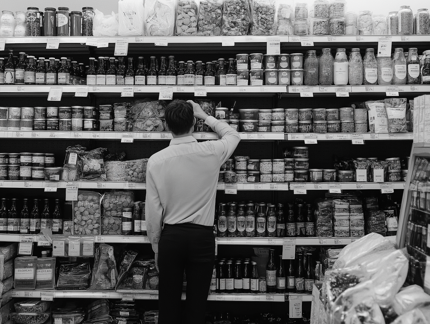 A person shops for groceries in a black-and-white image, examining a shelf filled with jars, bottles, and packaged food items.