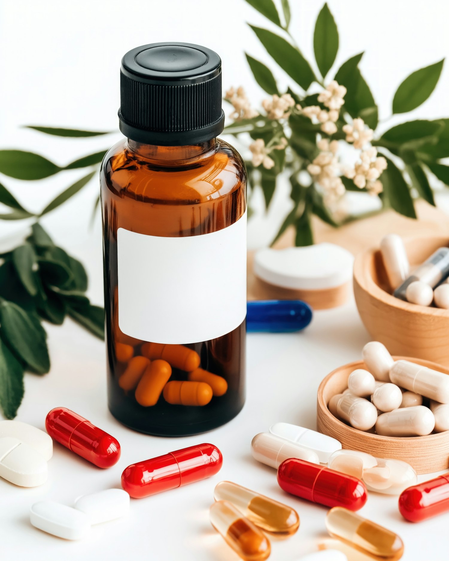 Brown glass bottle with colorful capsules and tablets, surrounded by green leaves and flowers, evoking a natural supplement theme.