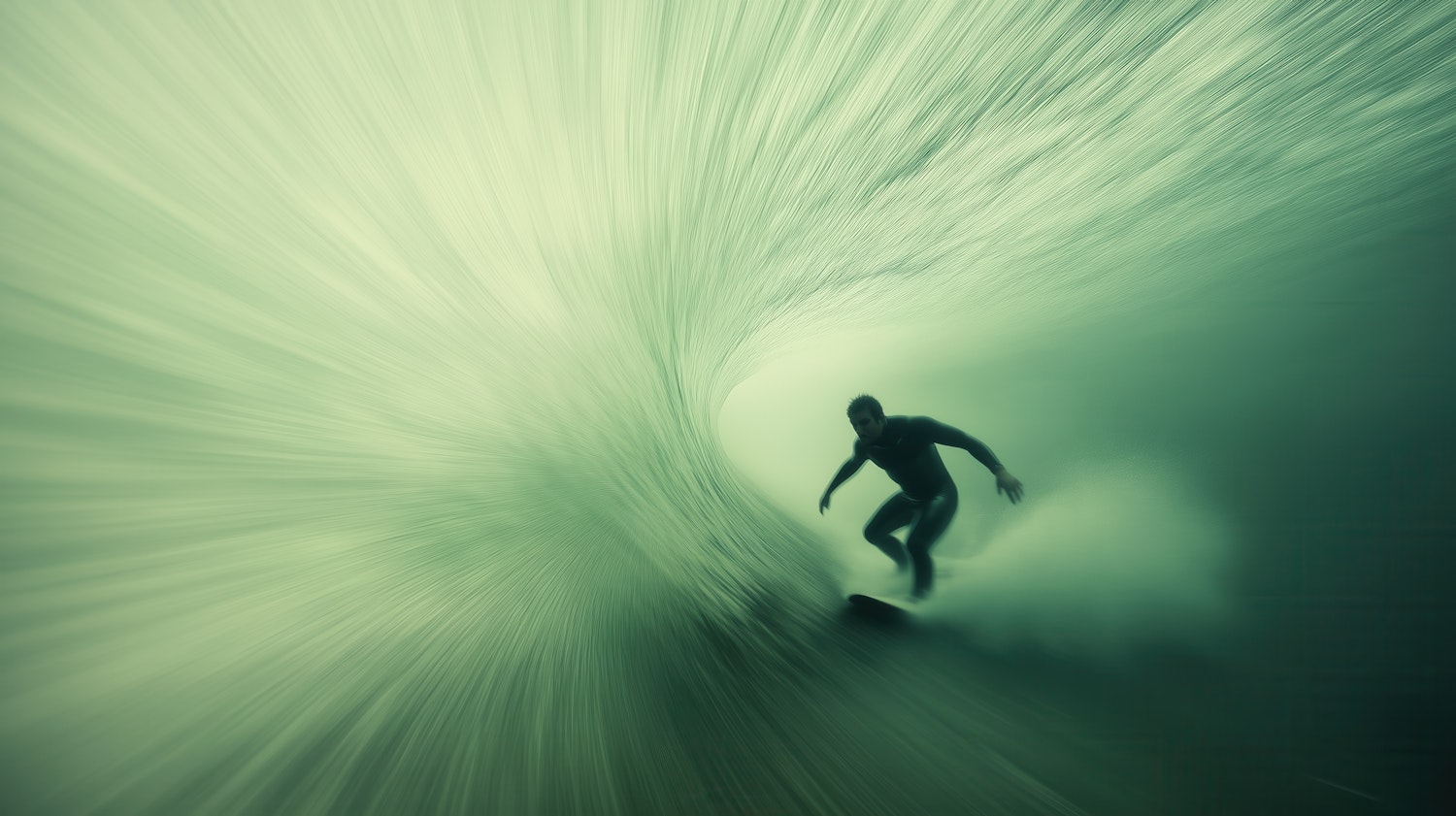 Surfer riding inside a stunning green wave barrel, captured with dynamic lighting and motion for an ethereal, action-packed vibe.
