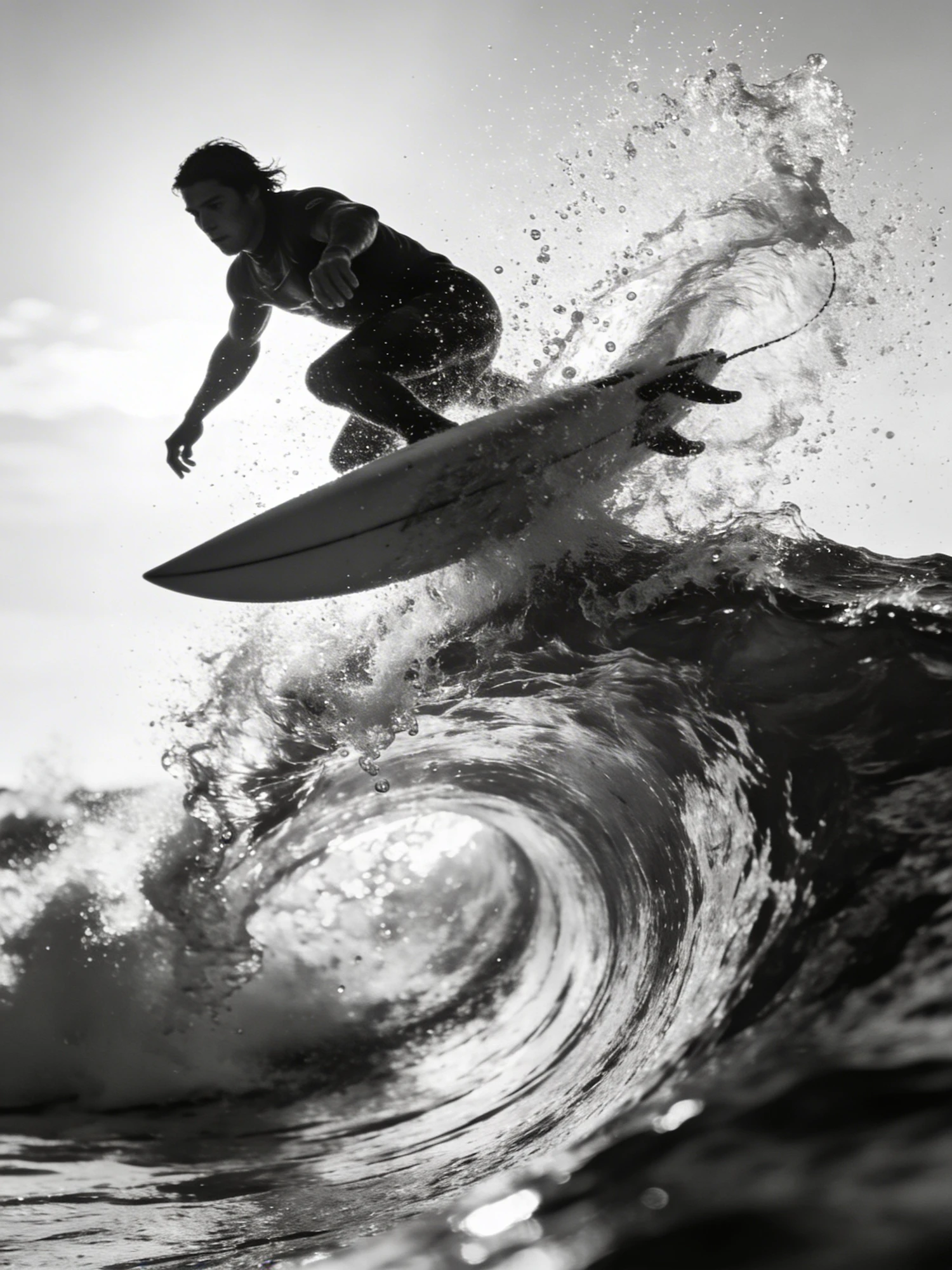 Black and white photo of a surfer riding a curling wave, showcasing dynamic motion and dramatic contrast.