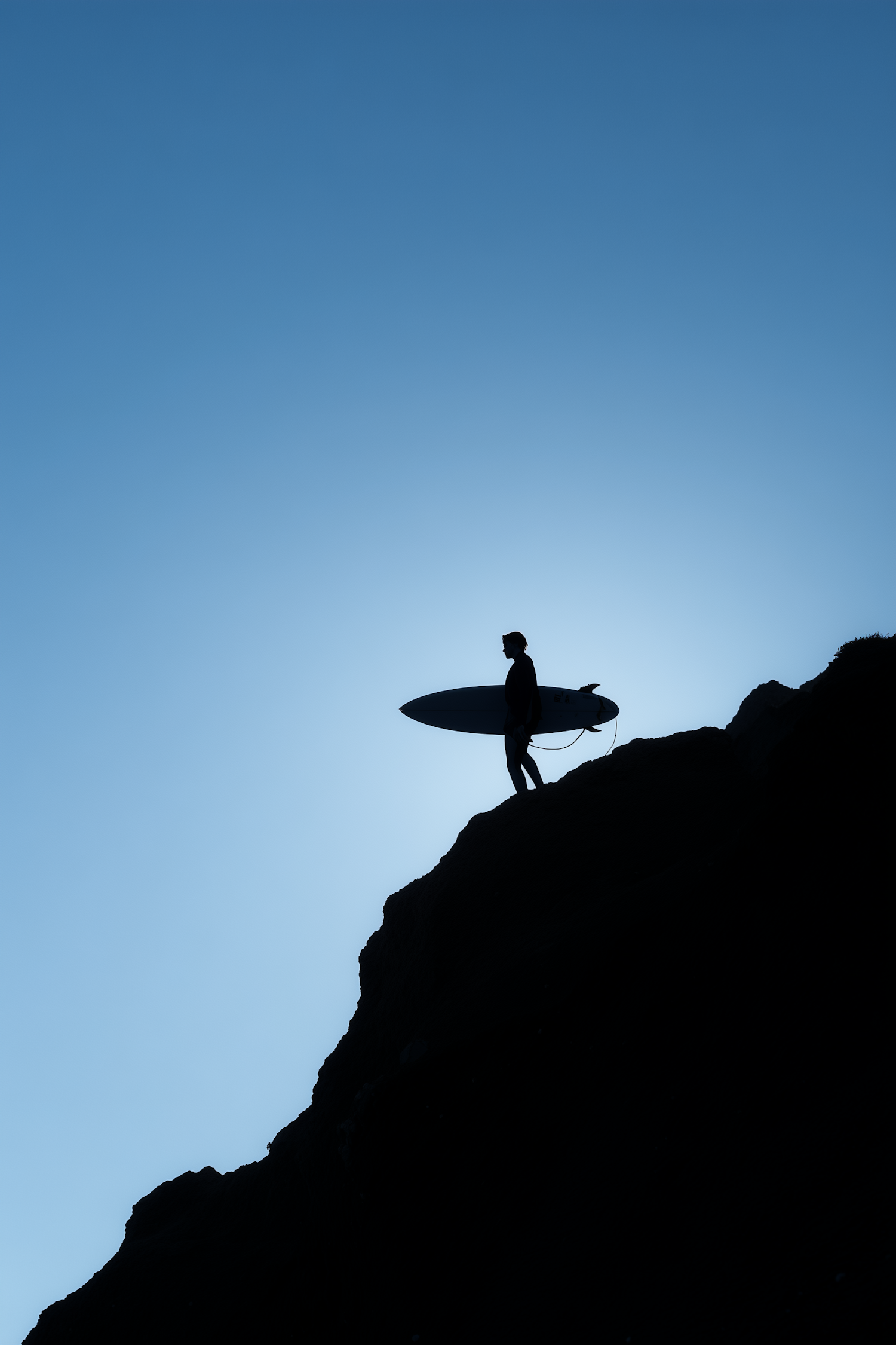Silhouette of a surfer with a board on a cliff against a clear blue sky, capturing a serene and adventurous moment.