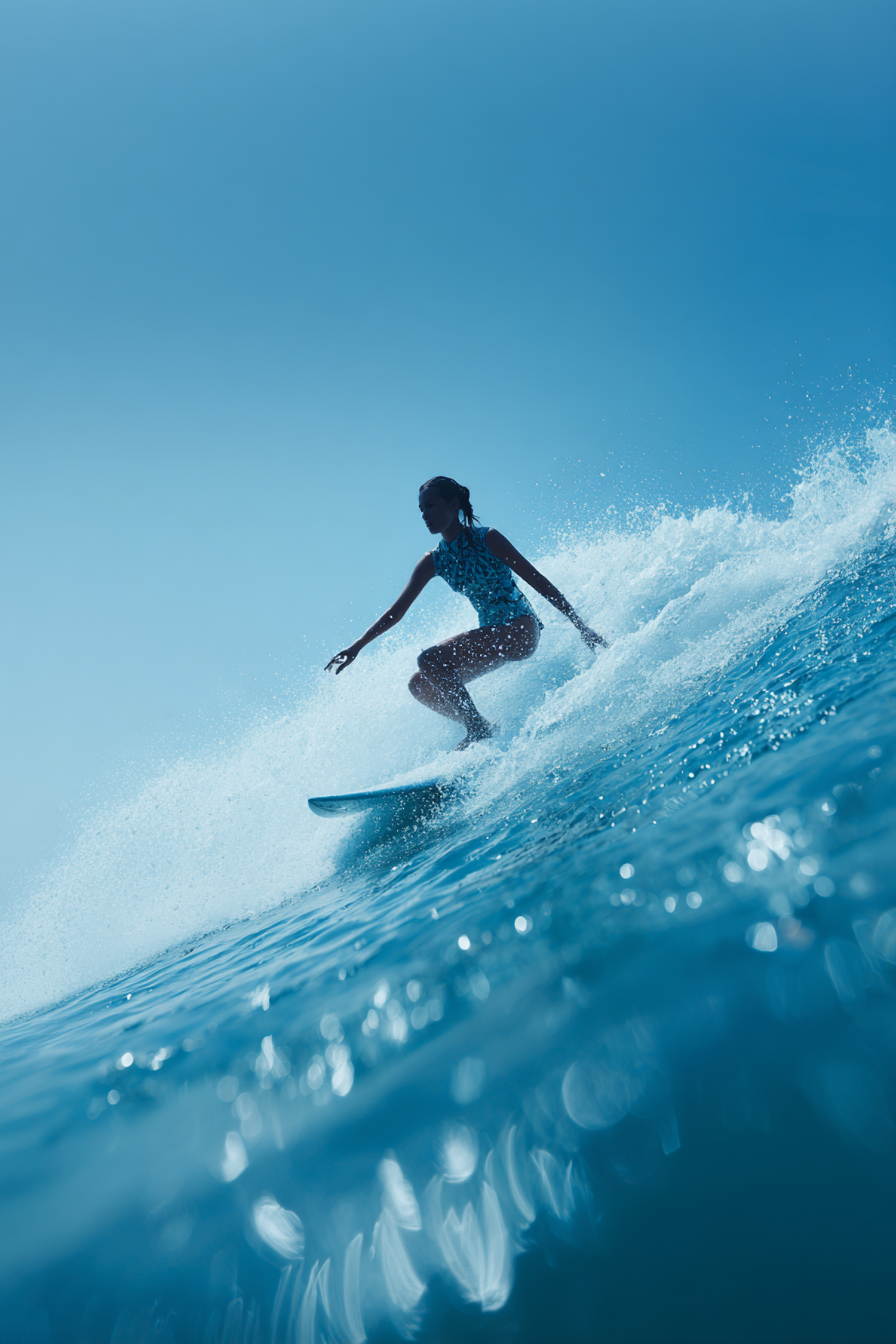 A surfer rides a wave under a clear blue sky, showcasing skill and balance. The sparkling water and dynamic pose create an energetic vibe.
