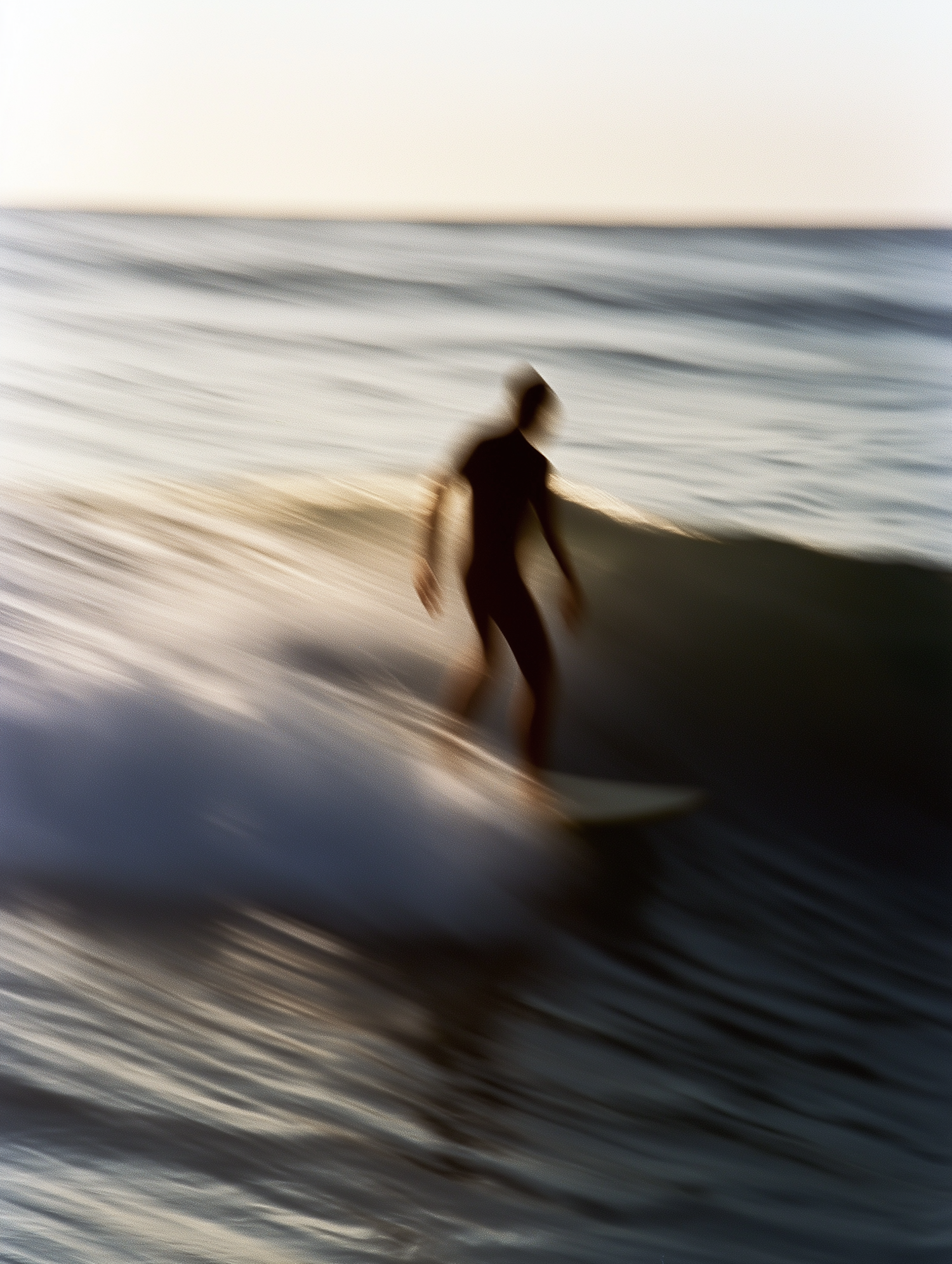 Blurred surfer riding a wave, capturing motion and speed in a serene ocean setting.