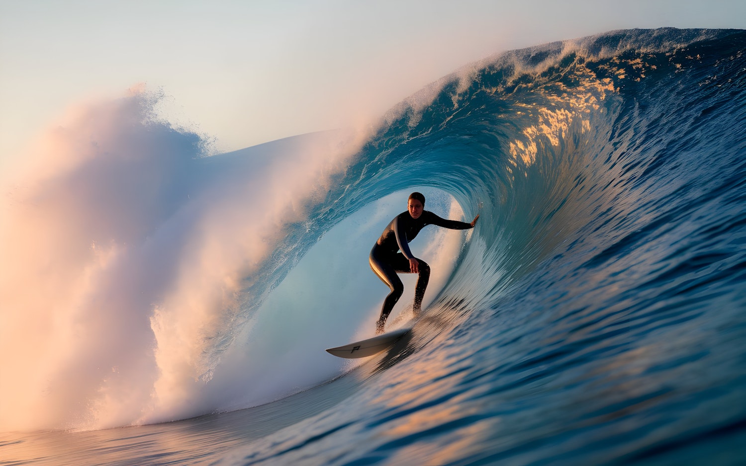 Surfer riding a massive blue wave at sunset, wearing a black wetsuit. Golden sunlight highlights the wave's crest, creating a stunning scene.