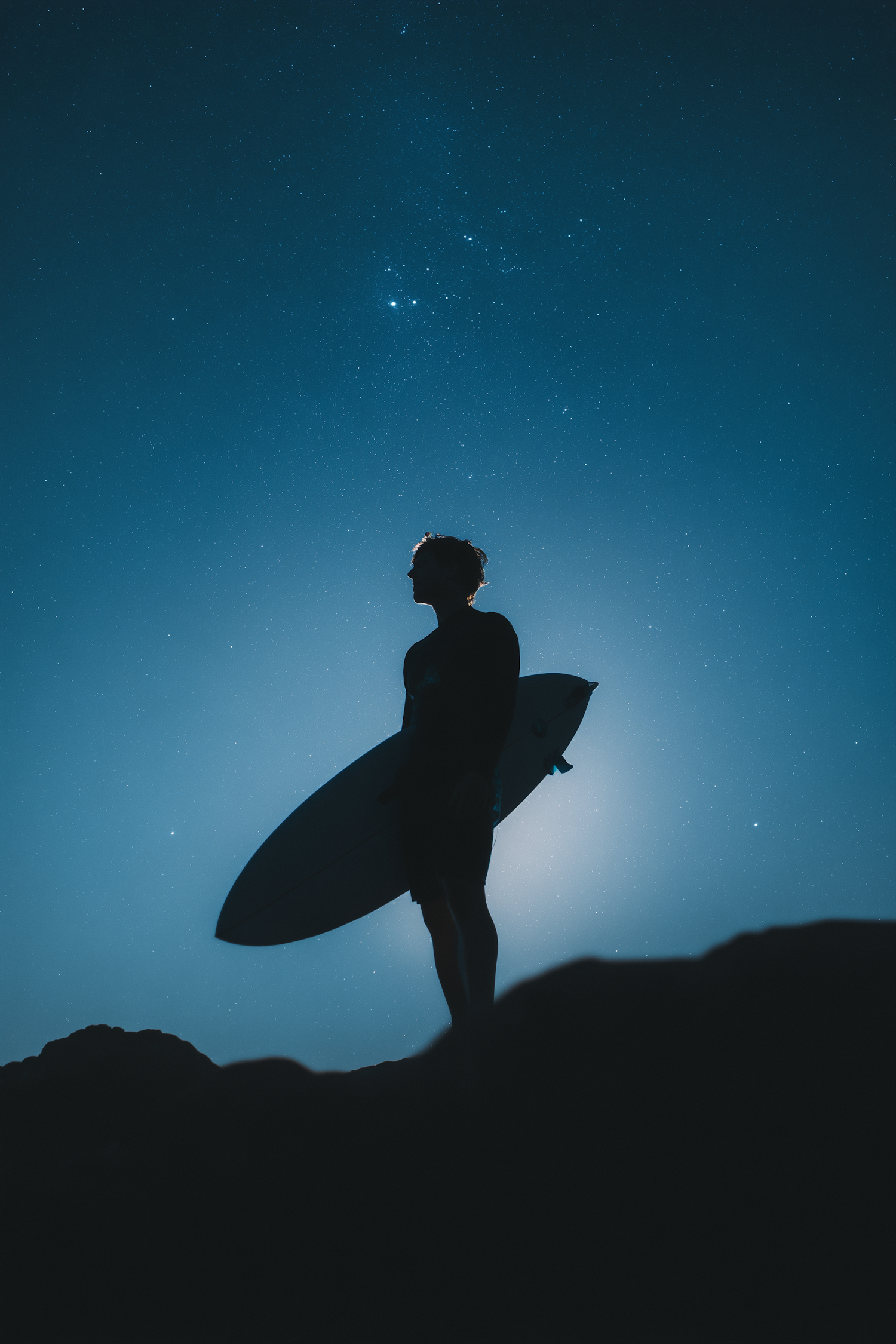 Silhouette of a surfer holding a board under a starry night sky, standing on rocky terrain with a serene and tranquil atmosphere.