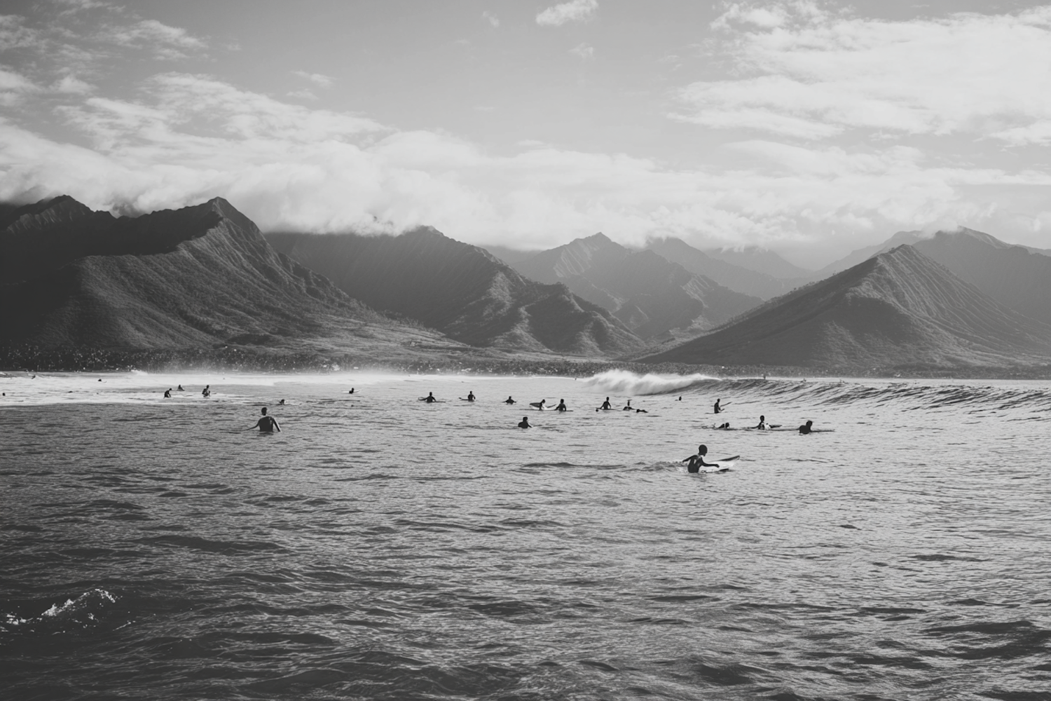 Surfers waiting for waves in a serene ocean setting, with a dramatic mountain range in the background under a cloudy sky.