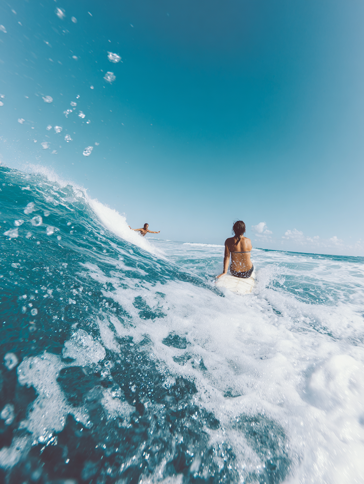 Two surfers enjoying the ocean waves under a clear blue sky, with vibrant water and dynamic splashes creating a lively scene.