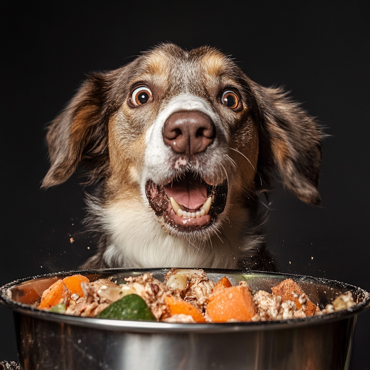 A surprised dog with wide eyes behind a bowl of colorful food, featuring orange and green vegetables, against a dark background.