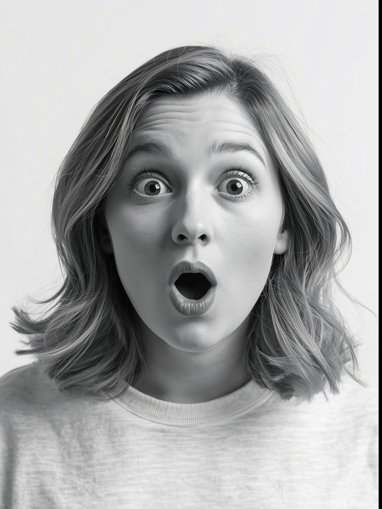 Grayscale portrait of a surprised young woman with wide eyes and open mouth, wearing a light top against a plain background.