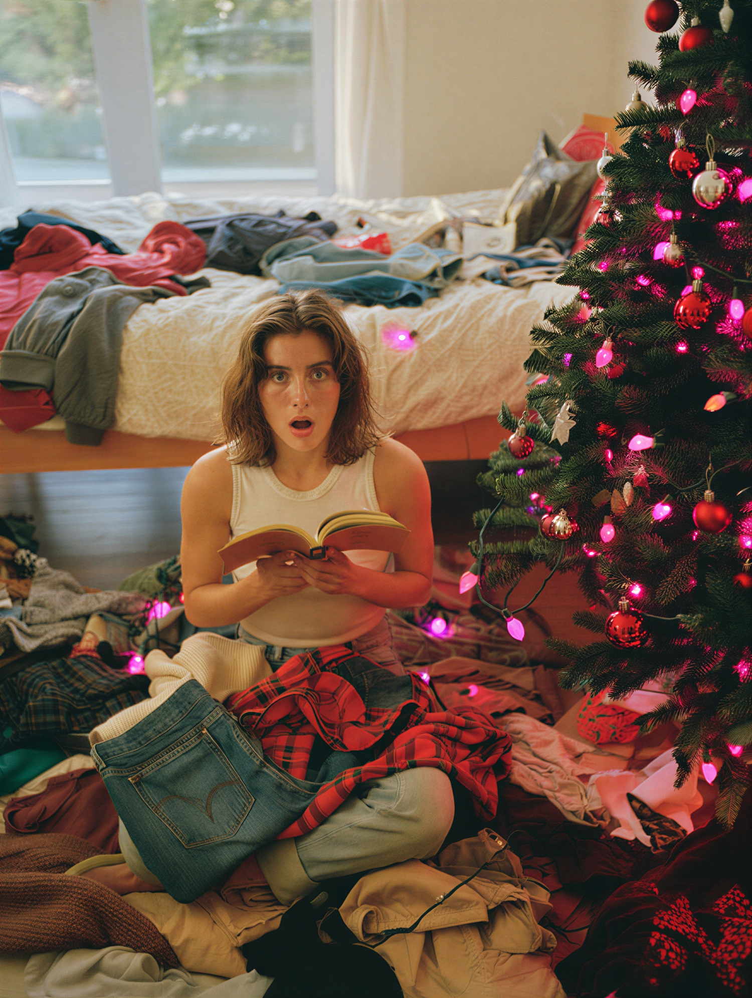 A surprised woman sits amidst a cluttered room with a festive Christmas tree nearby, holding a book and surrounded by scattered clothes.
