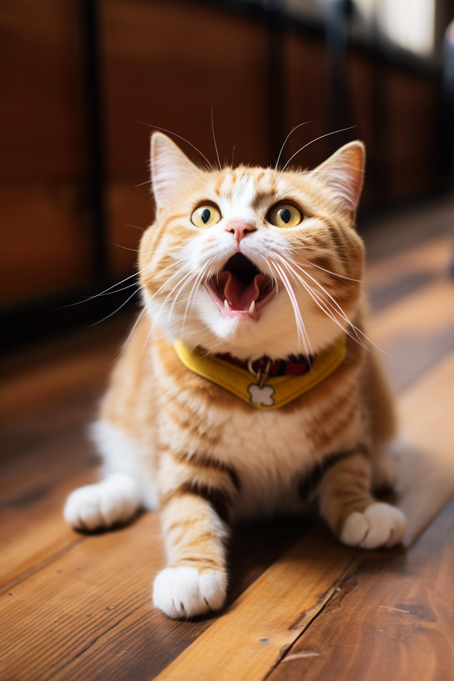 Ginger and white cat with yellow eyes and a yellow collar, mid-meow on a wooden floor. Expressive and lively feline portrait.