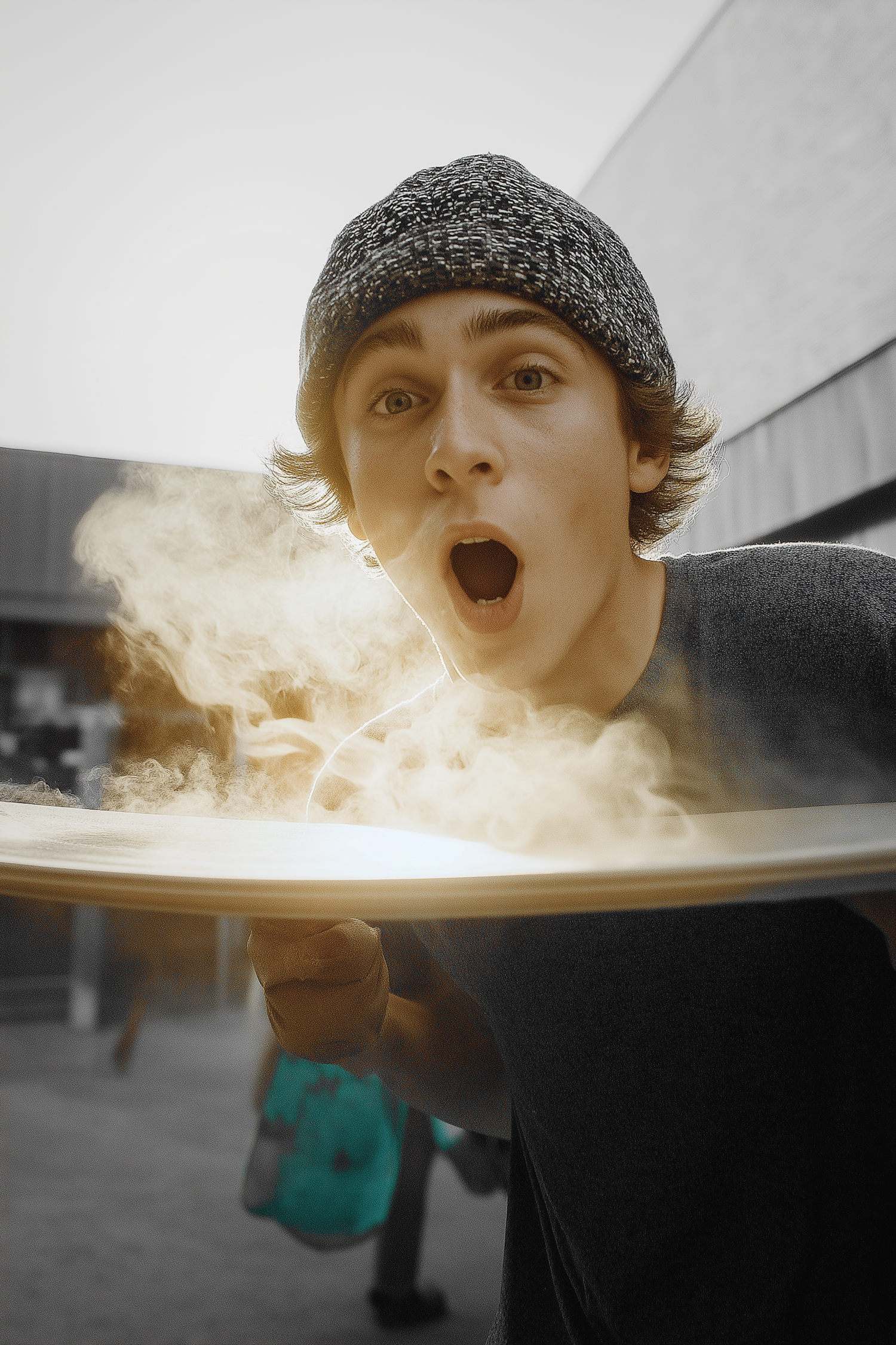A young person holding a steaming plate, their surprised expression illuminated by warm light, creating a dynamic and engaging scene.