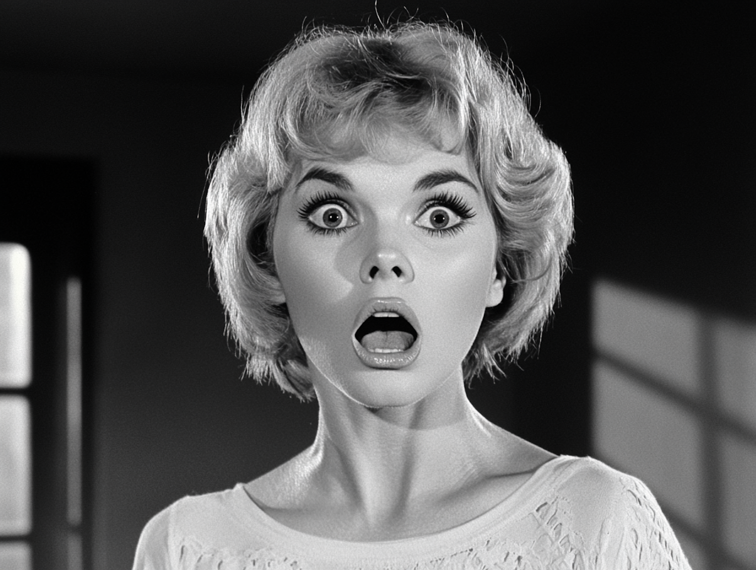 Black and white image of a surprised woman with short blonde hair, wide eyes, and open mouth, conveying shock or astonishment.