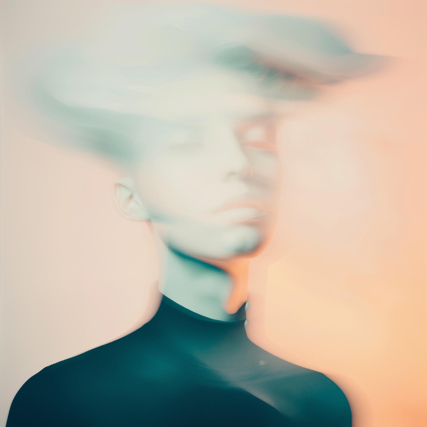 Abstract portrait with blurred face, light skin, dark high-neck outfit, and warm peach-beige background. Dreamlike and surreal aesthetic.