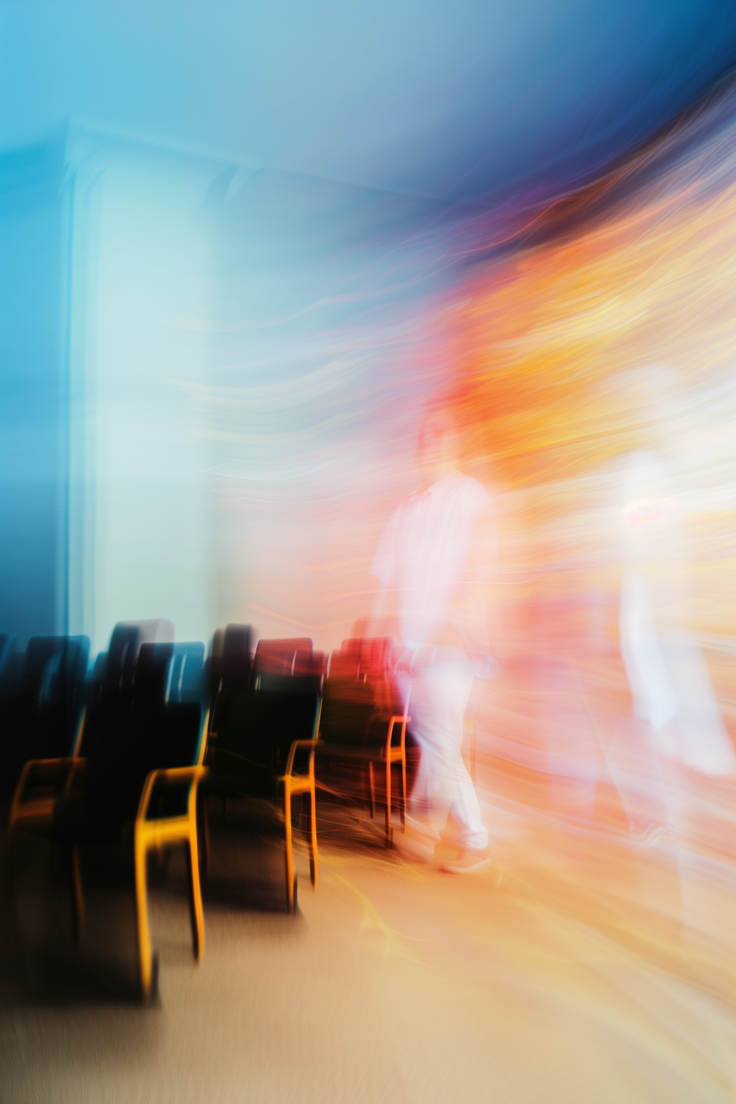 Abstract image with blurred motion, vibrant blue and orange hues, black chairs, and a ghostly figure in white for a surreal effect.