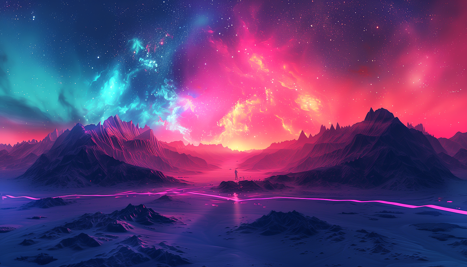 Surreal landscape with vibrant pink and purple mountains, a cosmic sky, and a lone figure. A glowing path adds intrigue and wonder.