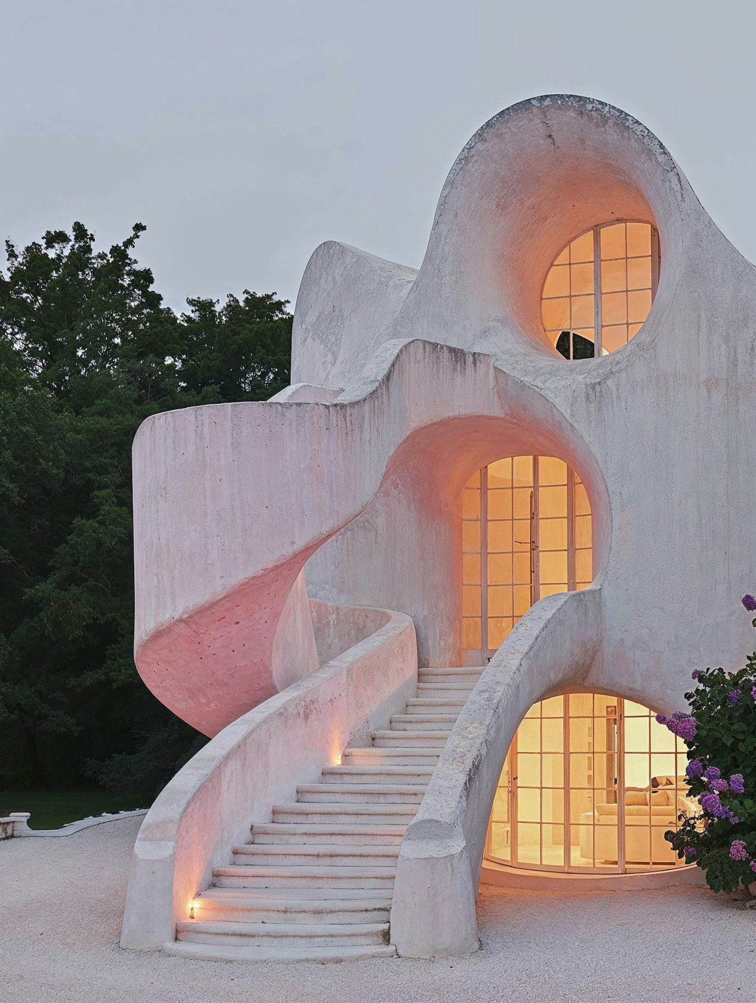 Modern architectural marvel with flowing curves, circular windows, and warm lighting, set against lush greenery and purple blossoms.