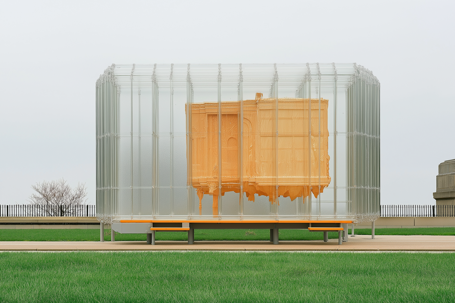A surreal outdoor art installation featuring a melting orange architectural sculpture encased in a translucent glass-like structure.