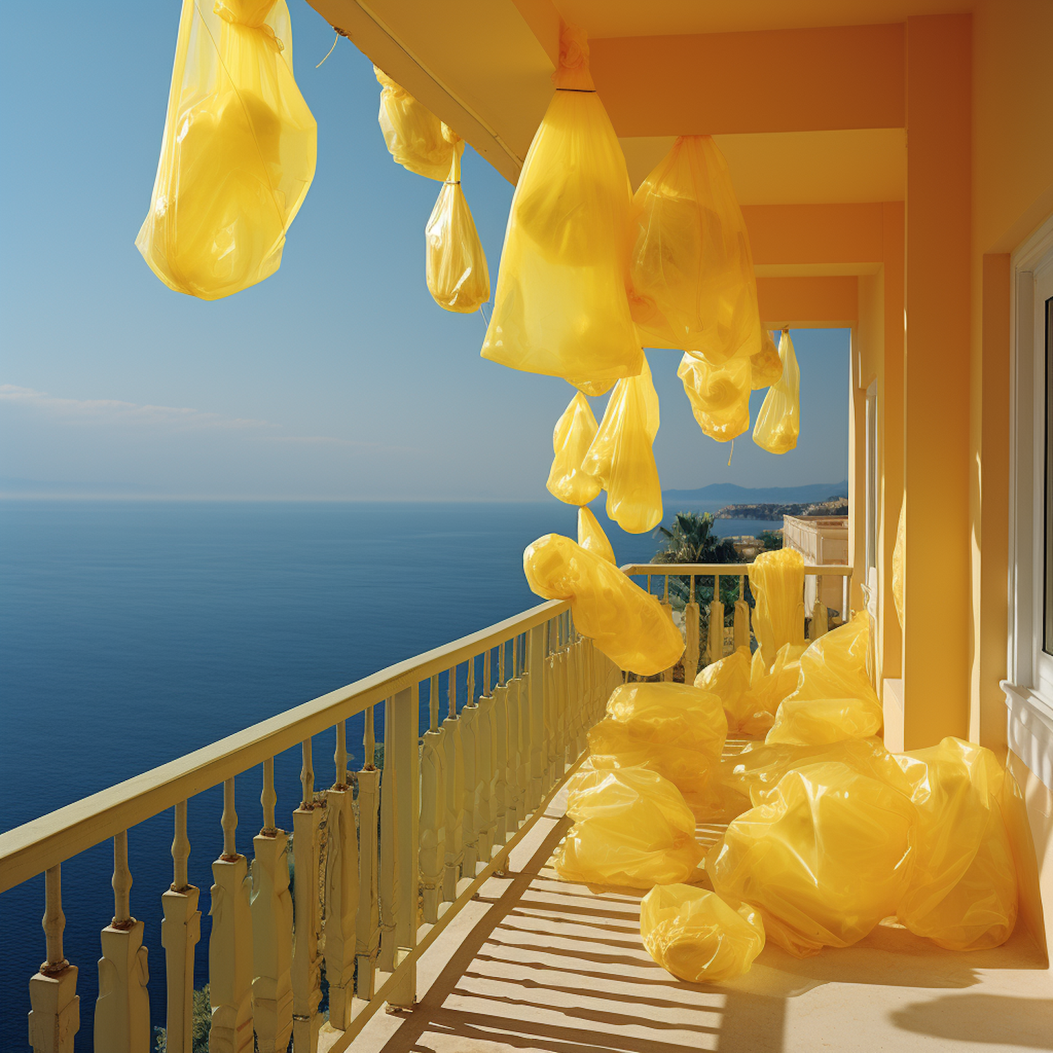 Sunlit balcony with yellow plastic bags against a blue ocean backdrop, creating a vibrant and artistic scene.