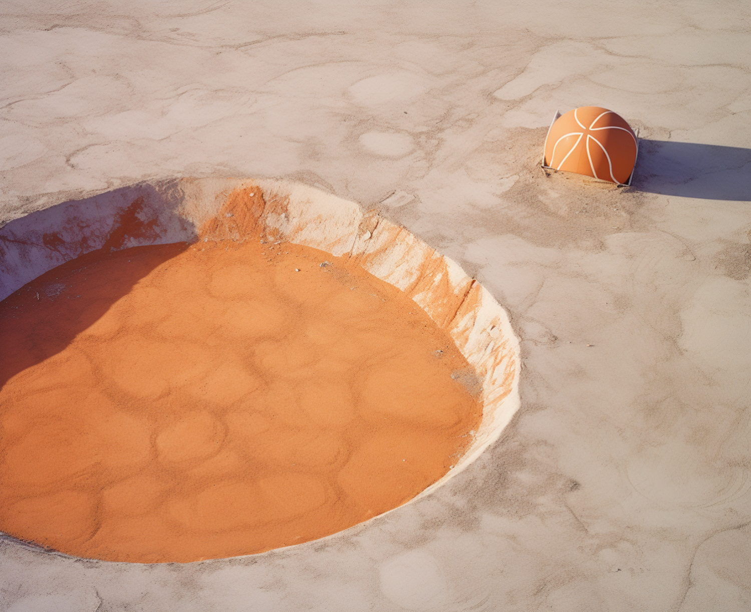 A basketball partially buried in a sandy desert landscape, near a circular sand-filled depression, under bright sunlight.