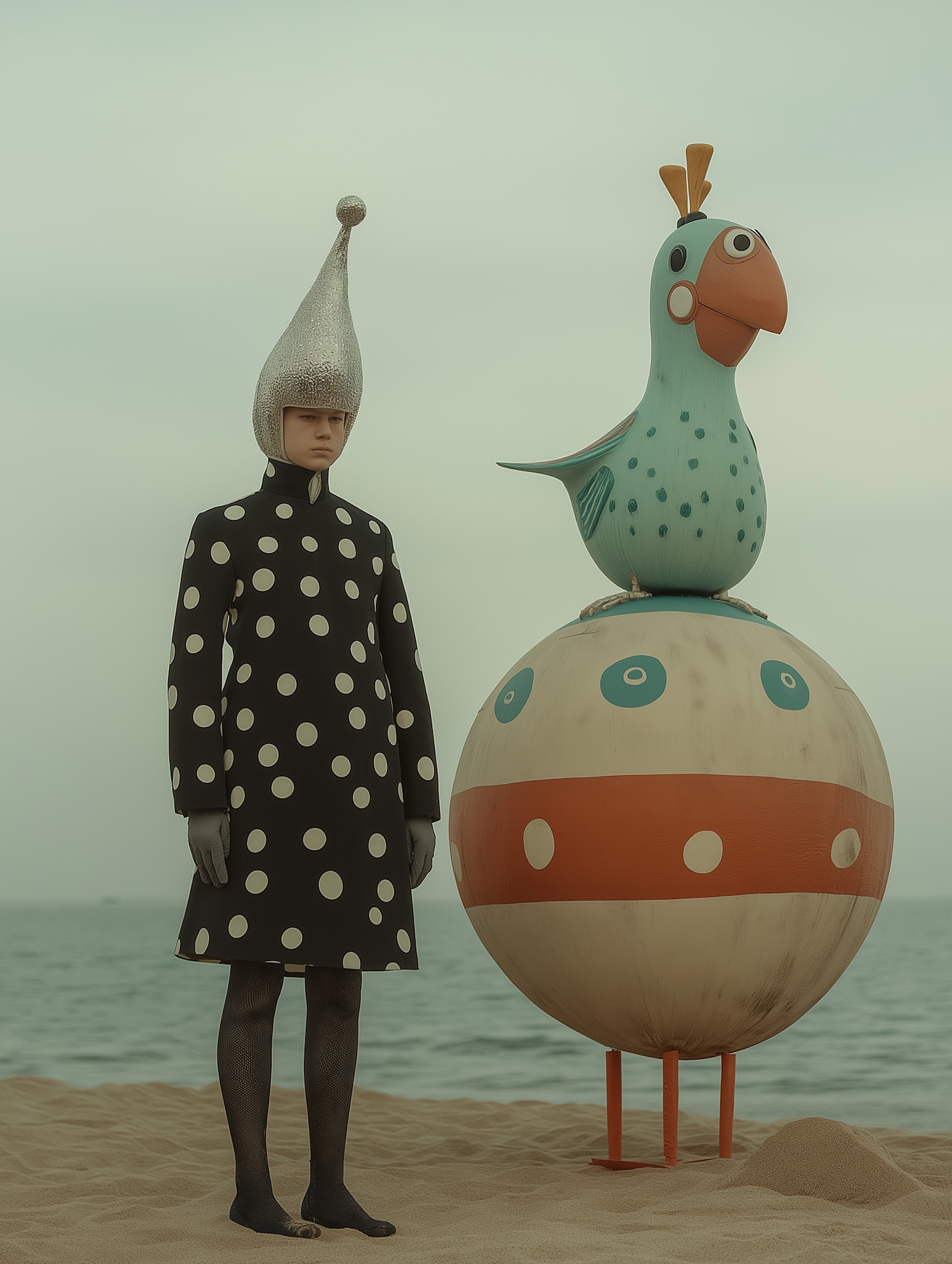 Surreal Beach Scene with Avant-garde Attire and Whimsical Bird Sculpture