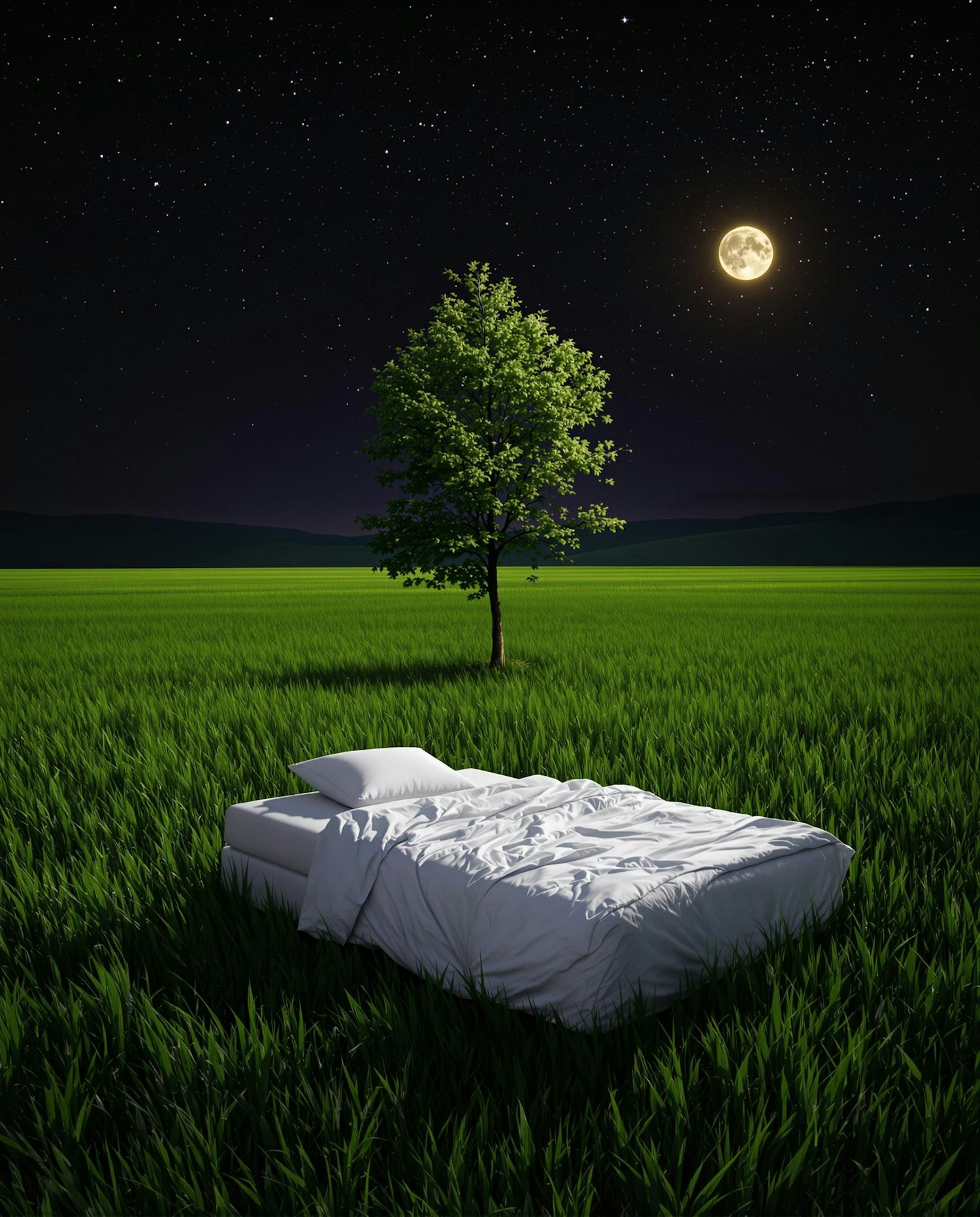 A white bed in a green field under a starry night sky with a full moon and a lone tree nearby. Dreamlike and serene setting.
