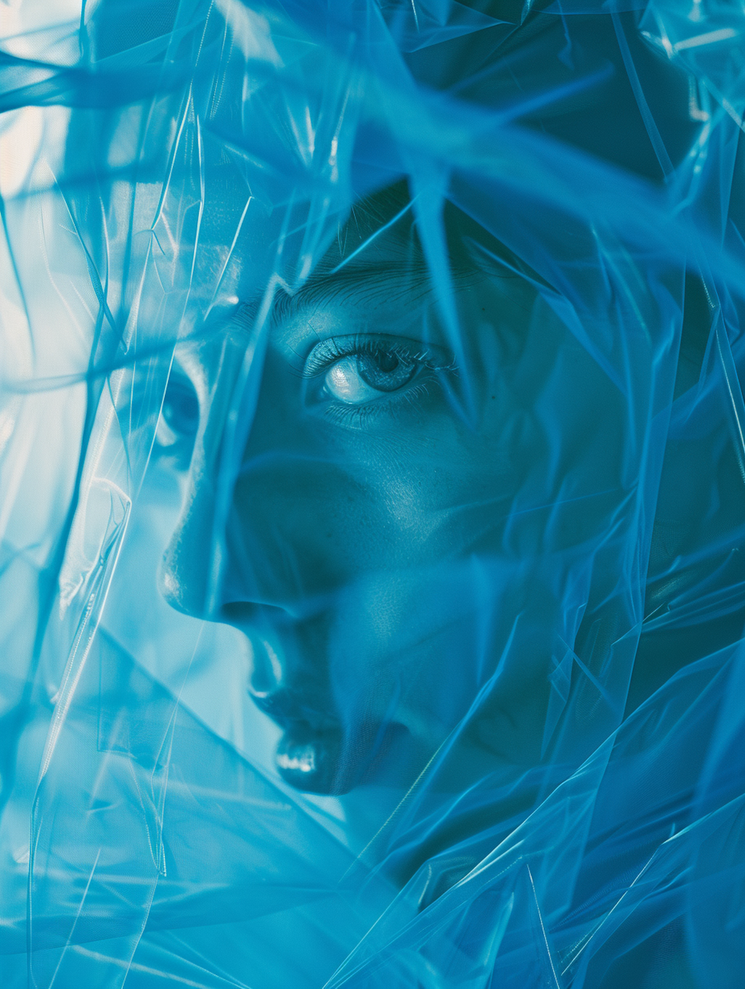 A close-up of a face through translucent blue plastic, creating a surreal and artistic vibe.