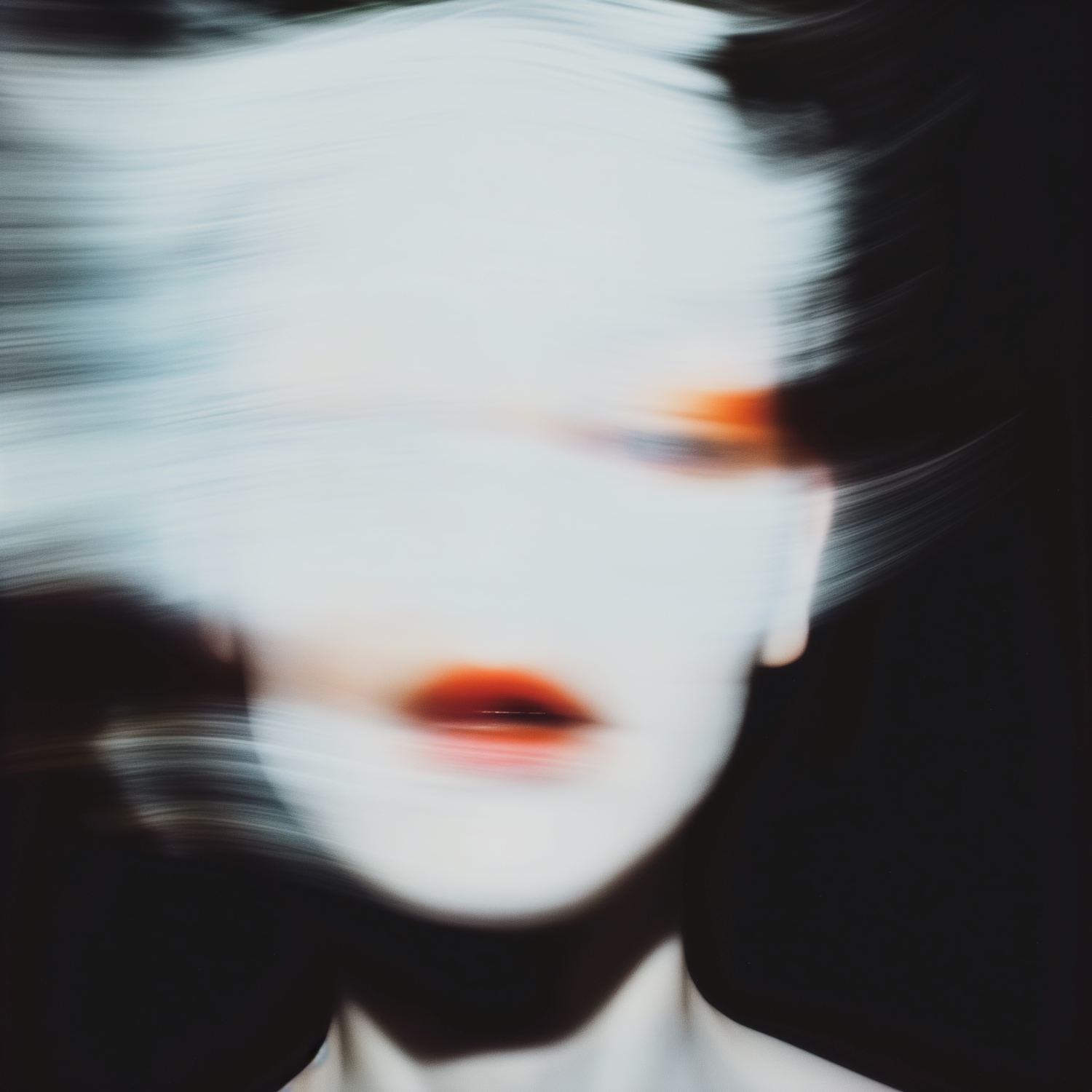 Abstract blurred portrait with white tones, red accents, and a dark background, creating a surreal and dreamlike aesthetic.