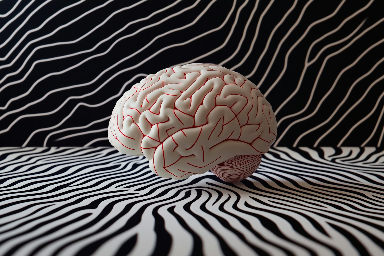 A white brain model with red grooves sits against a black and white wavy striped background, creating a surreal and hypnotic visual.