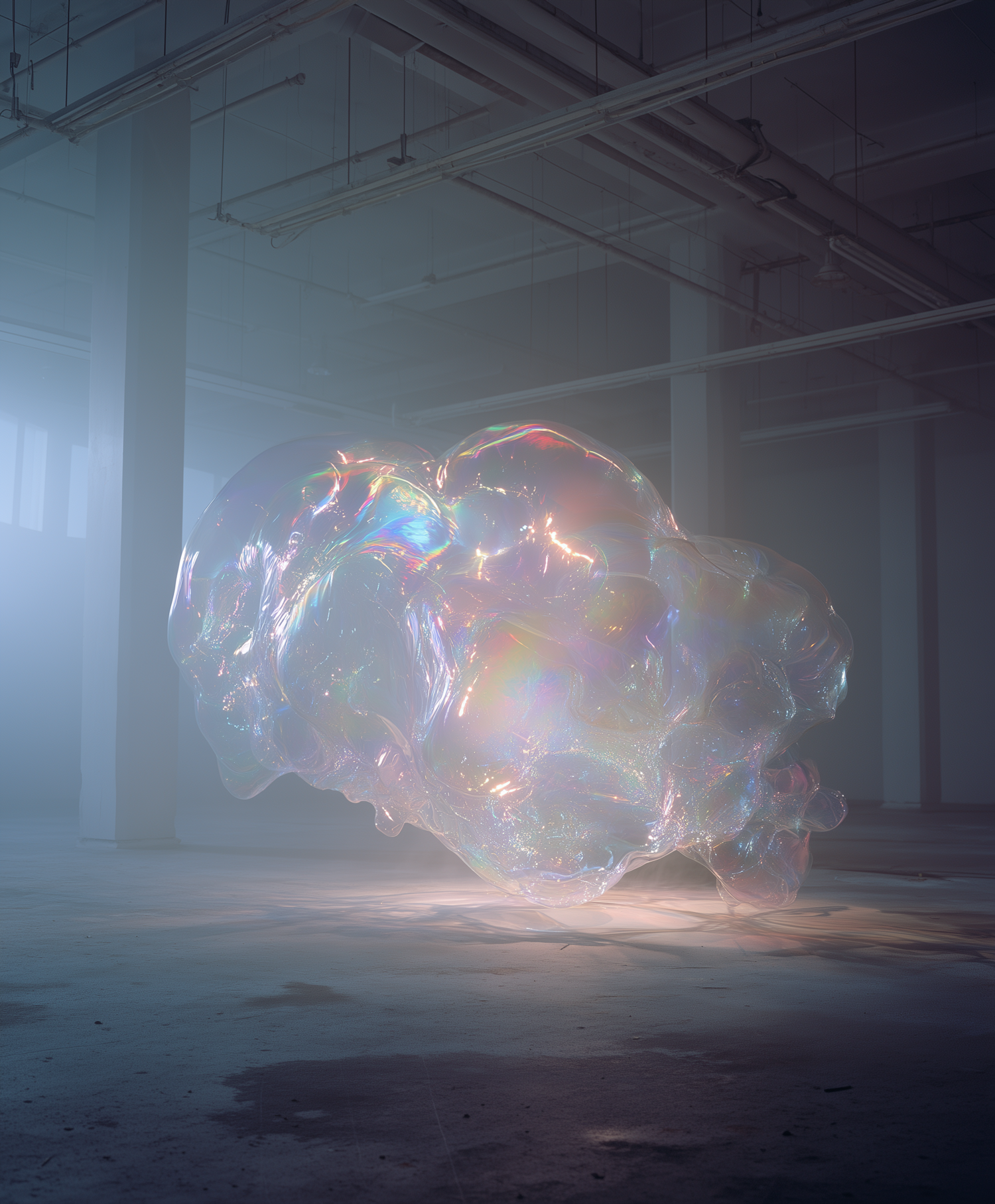 A glowing, iridescent bubble-like structure floats in a dimly lit industrial space, creating a surreal and dreamlike atmosphere.