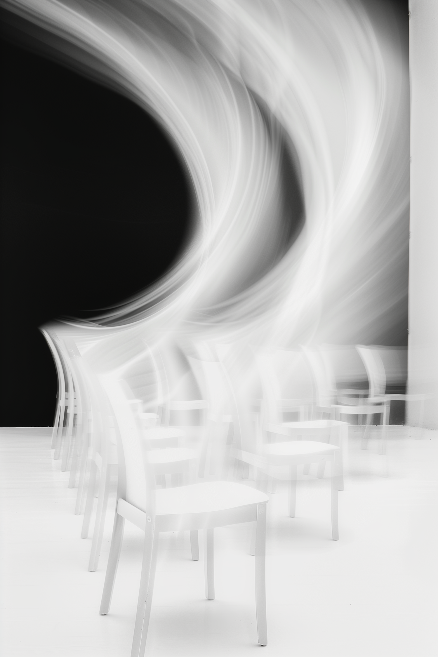 Abstract black-and-white image of white chairs in motion with swirling light streaks against a dark background, creating a surreal effect.
